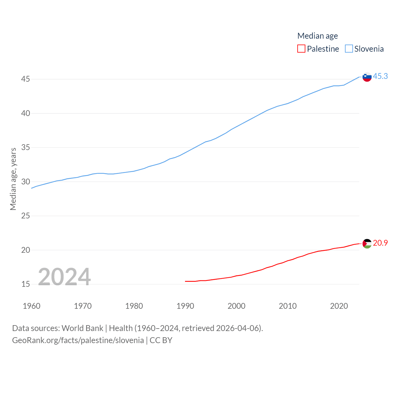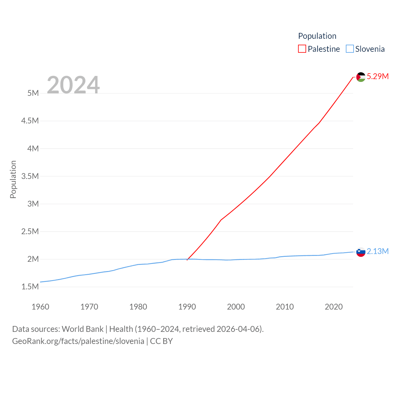Palestine has a population of 5.29M (ranked 122/197), compared with 2.13M in Slovenia (ranked 147/197). Palestine's land area is 2,326 sq mi versus 7,774 sq mi for Slovenia (ranked 164th vs. 151st).