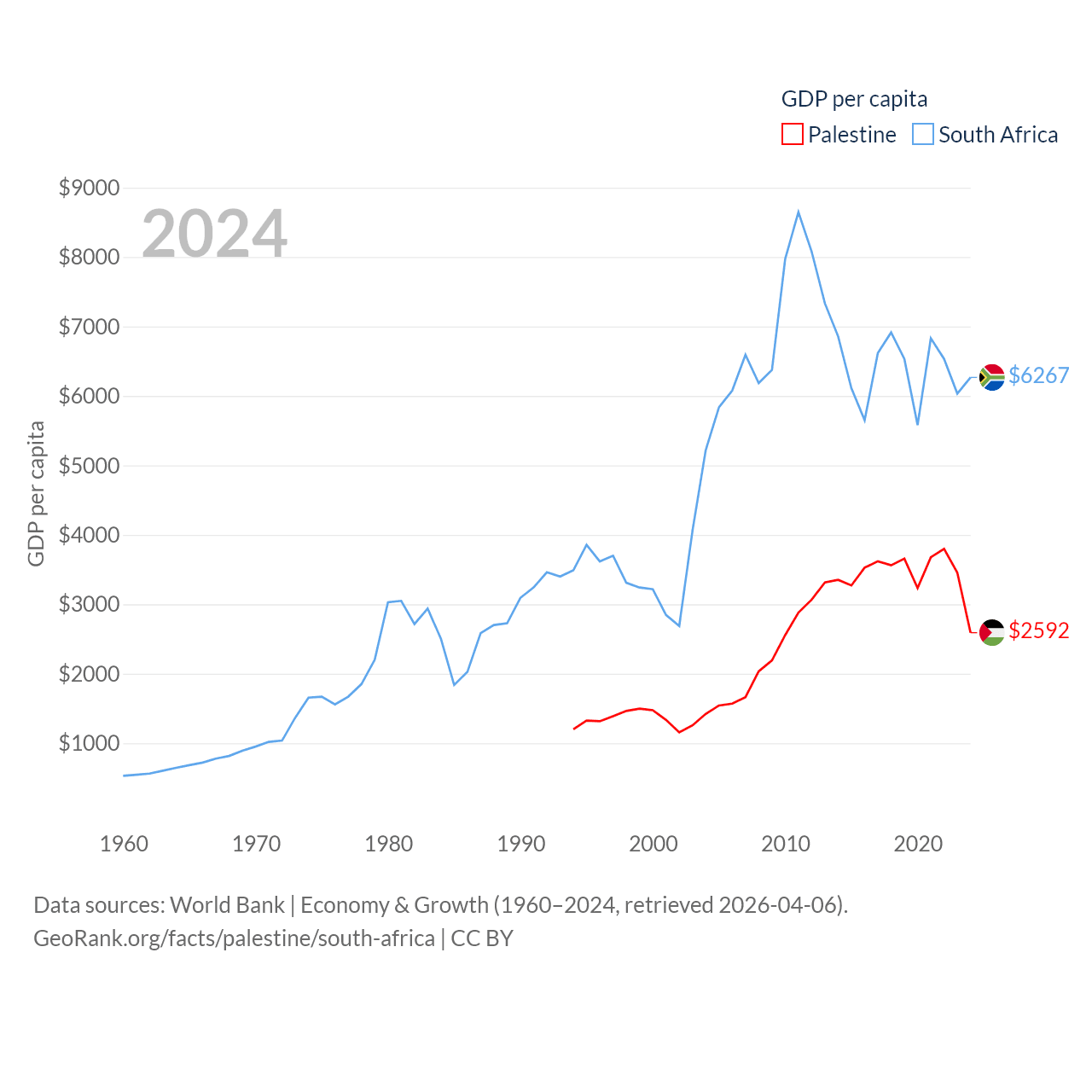 By GDP, Palestine ranks 146/197 ($13.7B) and South Africa ranks 40/197 ($401B). By GDP per capita, Palestine ranks 147/197 ($2,592), while South Africa ranks 111/197 ($6,267).