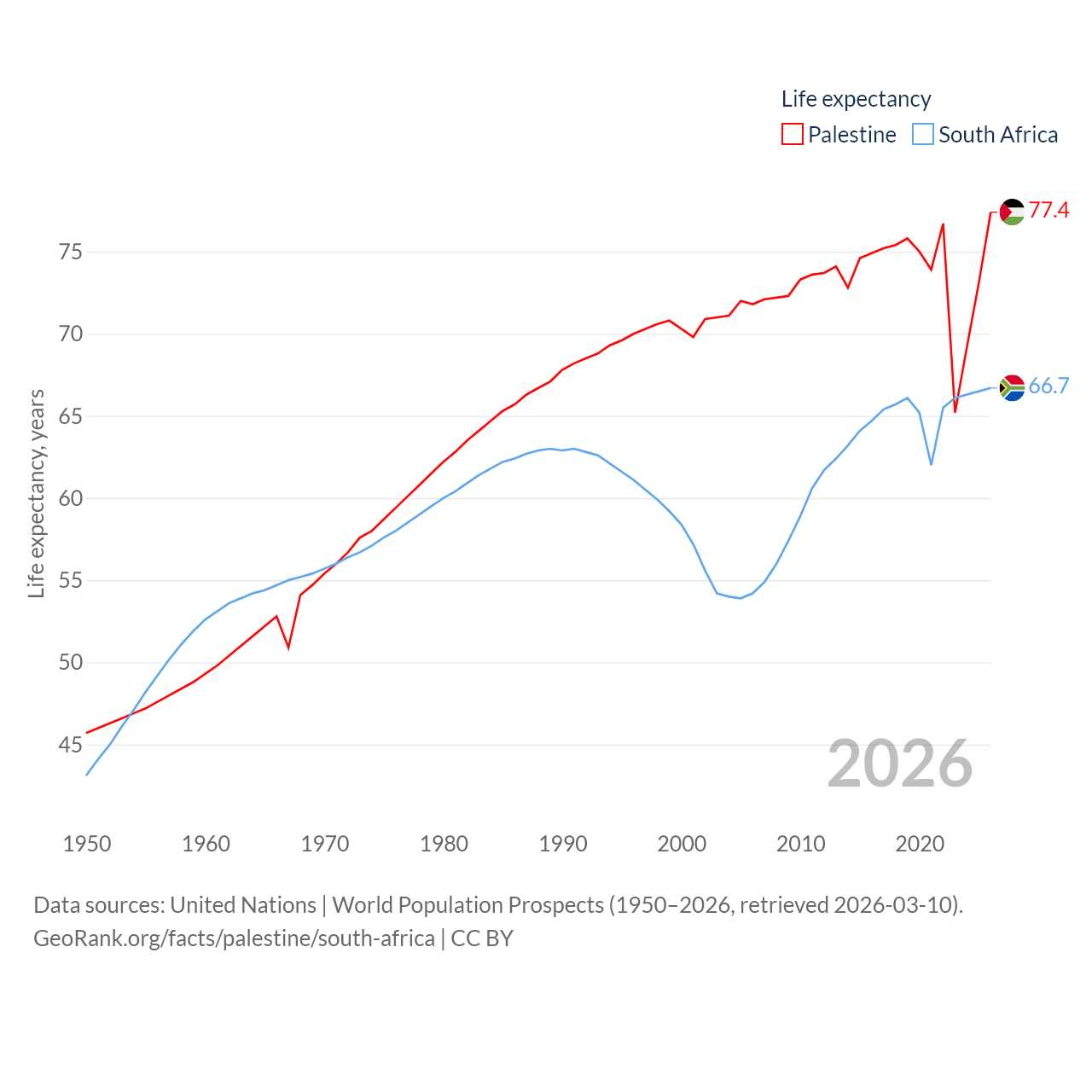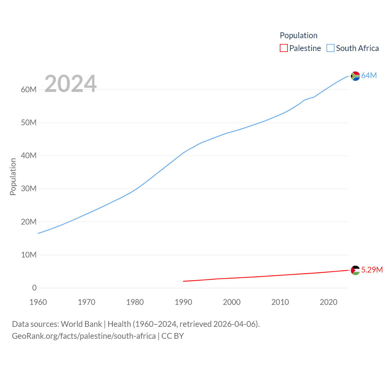 Palestine has a population of 5.29M (ranked 122/197), compared with 64M in South Africa (ranked 24/197). Palestine's land area is 2,326 sq mi versus 468,377 sq mi for South Africa (ranked 164th vs. 24th).