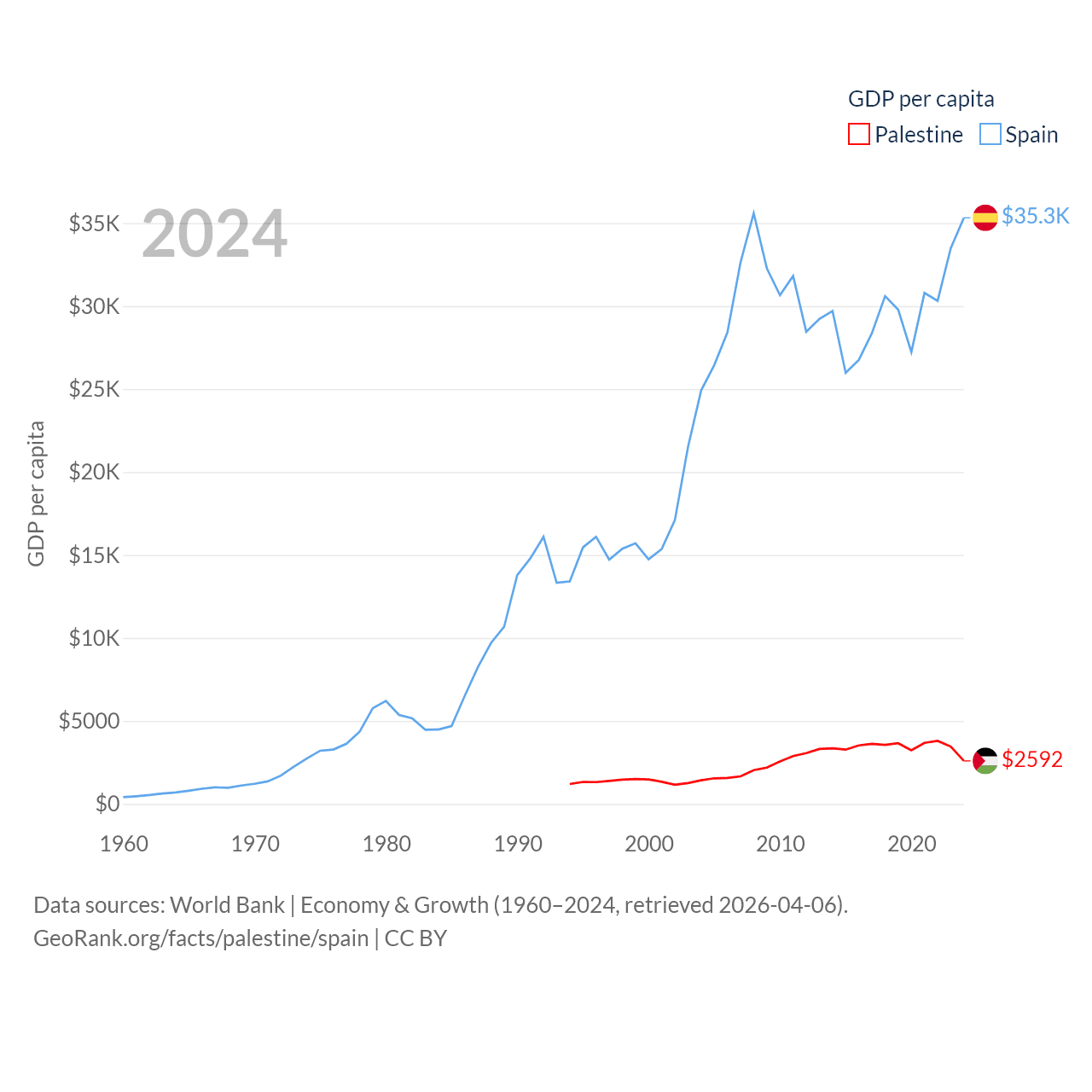 By GDP, Palestine ranks 146/197 ($13.7B) and Spain ranks 15/197 ($1.73T). By GDP per capita, Palestine ranks 147/197 ($2,592), while Spain ranks 32/197 ($35,327).