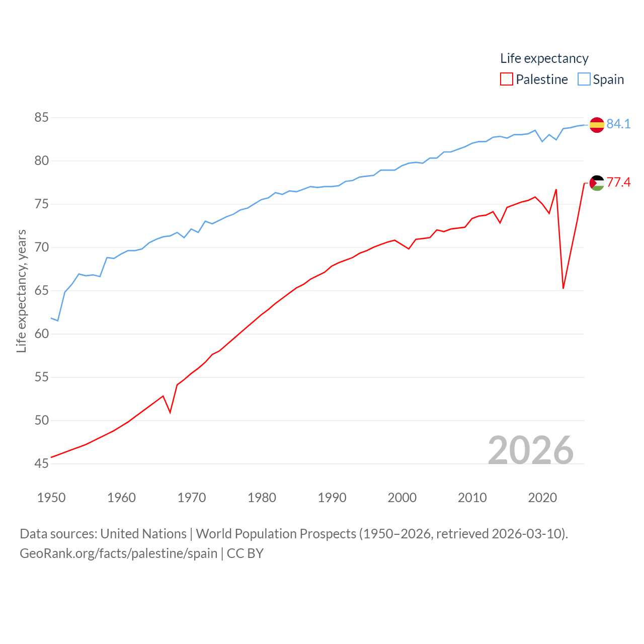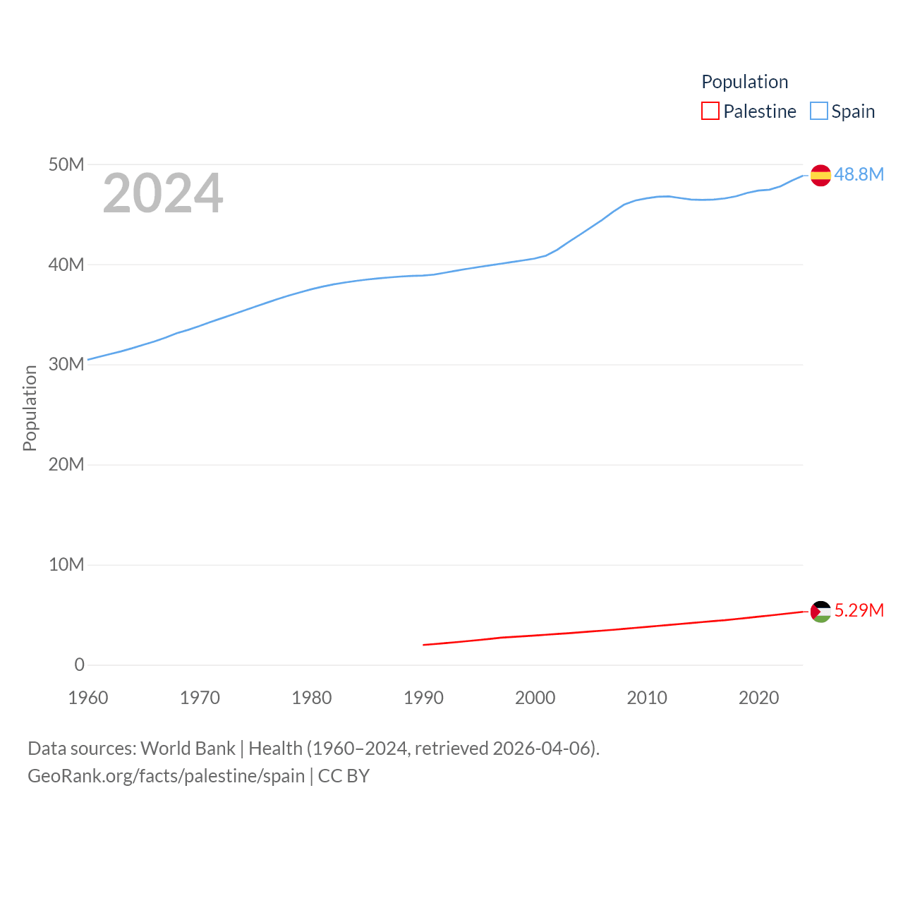 Palestine has a population of 5.29M (ranked 122/197), compared with 48.8M in Spain (ranked 32/197). Palestine's land area is 2,326 sq mi versus 192,934 sq mi for Spain (ranked 164th vs. 51st).
