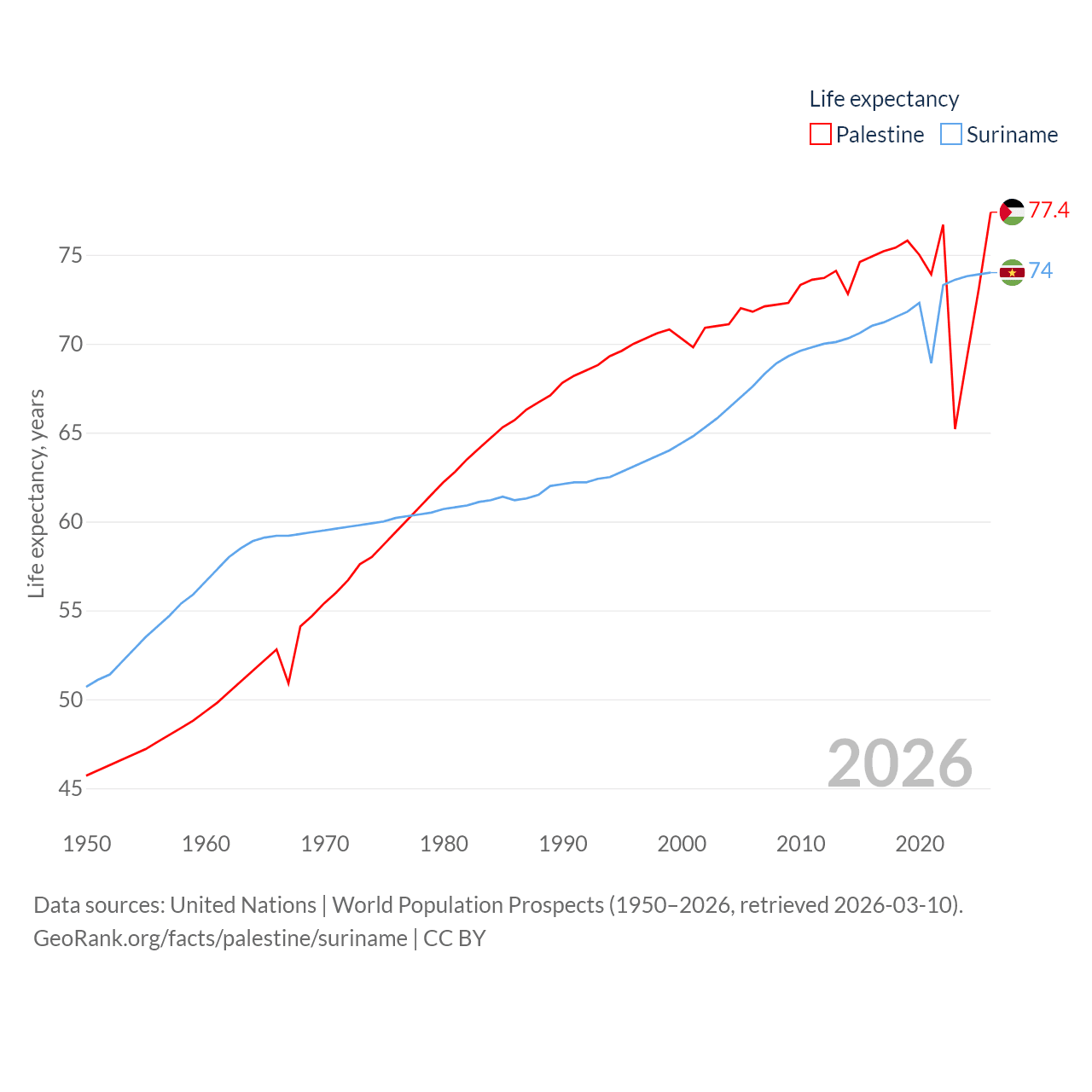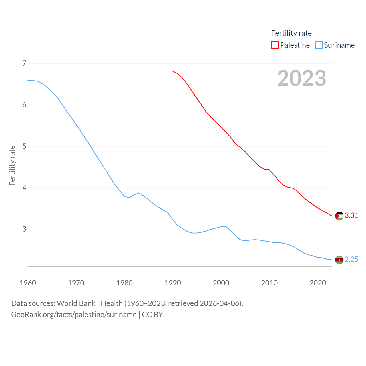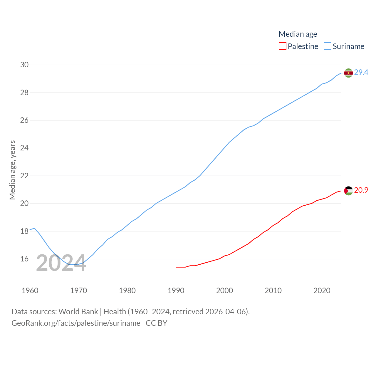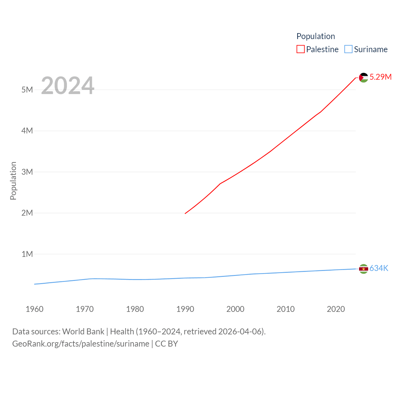Palestine has a population of 5.29M (ranked 122/197), compared with 634K in Suriname (ranked 165/197). Palestine's land area is 2,326 sq mi versus 61,972 sq mi for Suriname (ranked 164th vs. 90th).