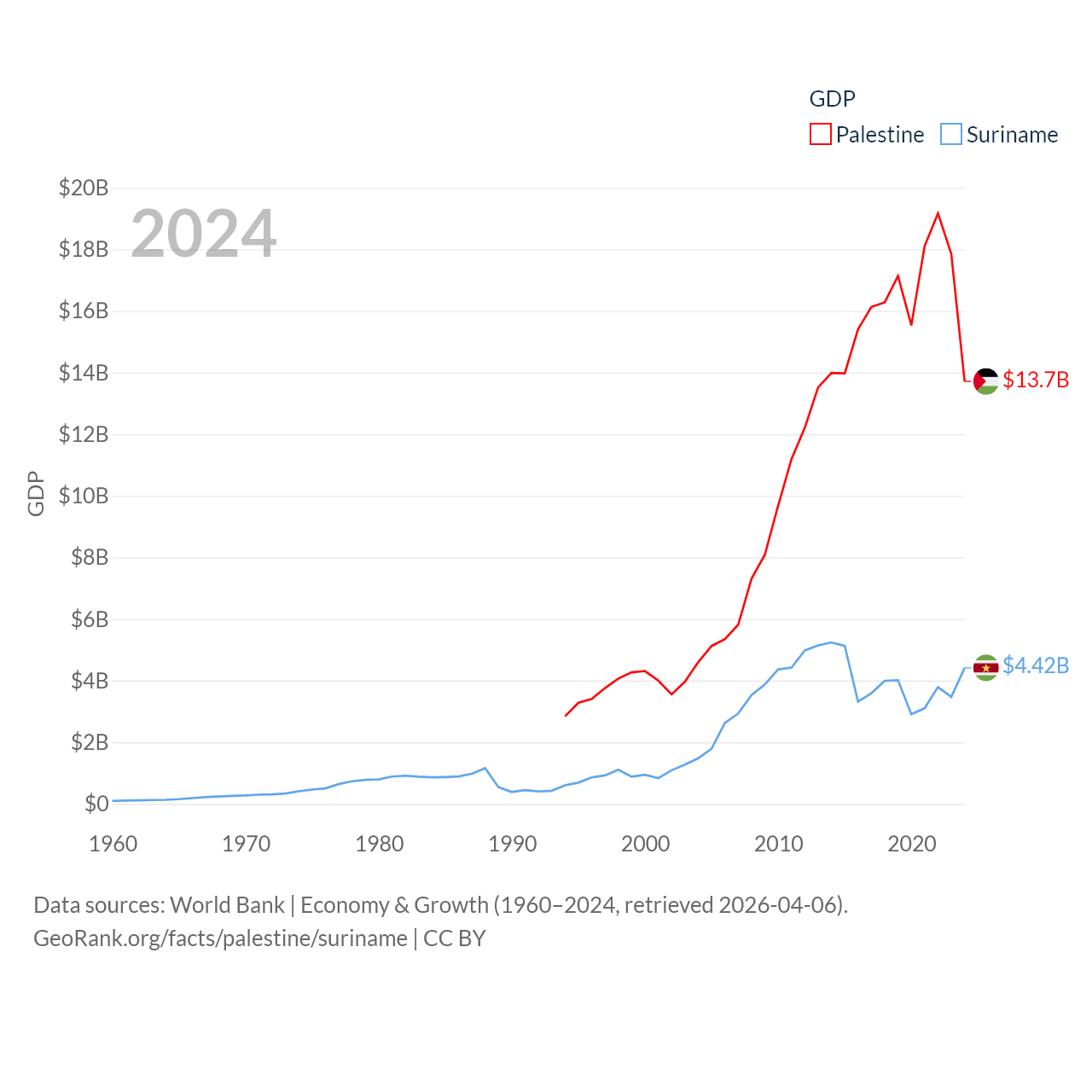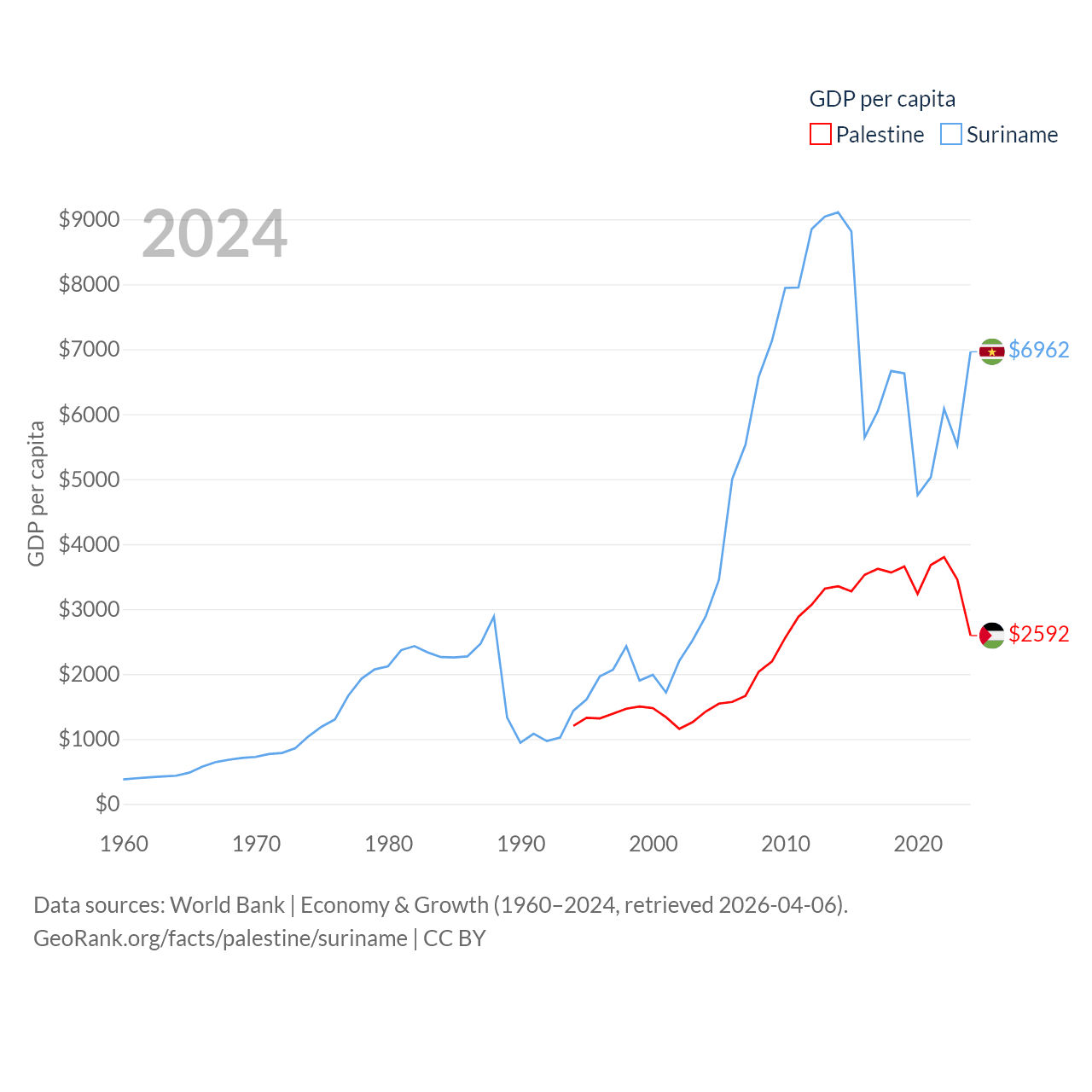 By GDP, Palestine ranks 146/197 ($13.7B) and Suriname ranks 164/197 ($4.42B). By GDP per capita, Palestine ranks 147/197 ($2,592), while Suriname ranks 102/197 ($6,962).