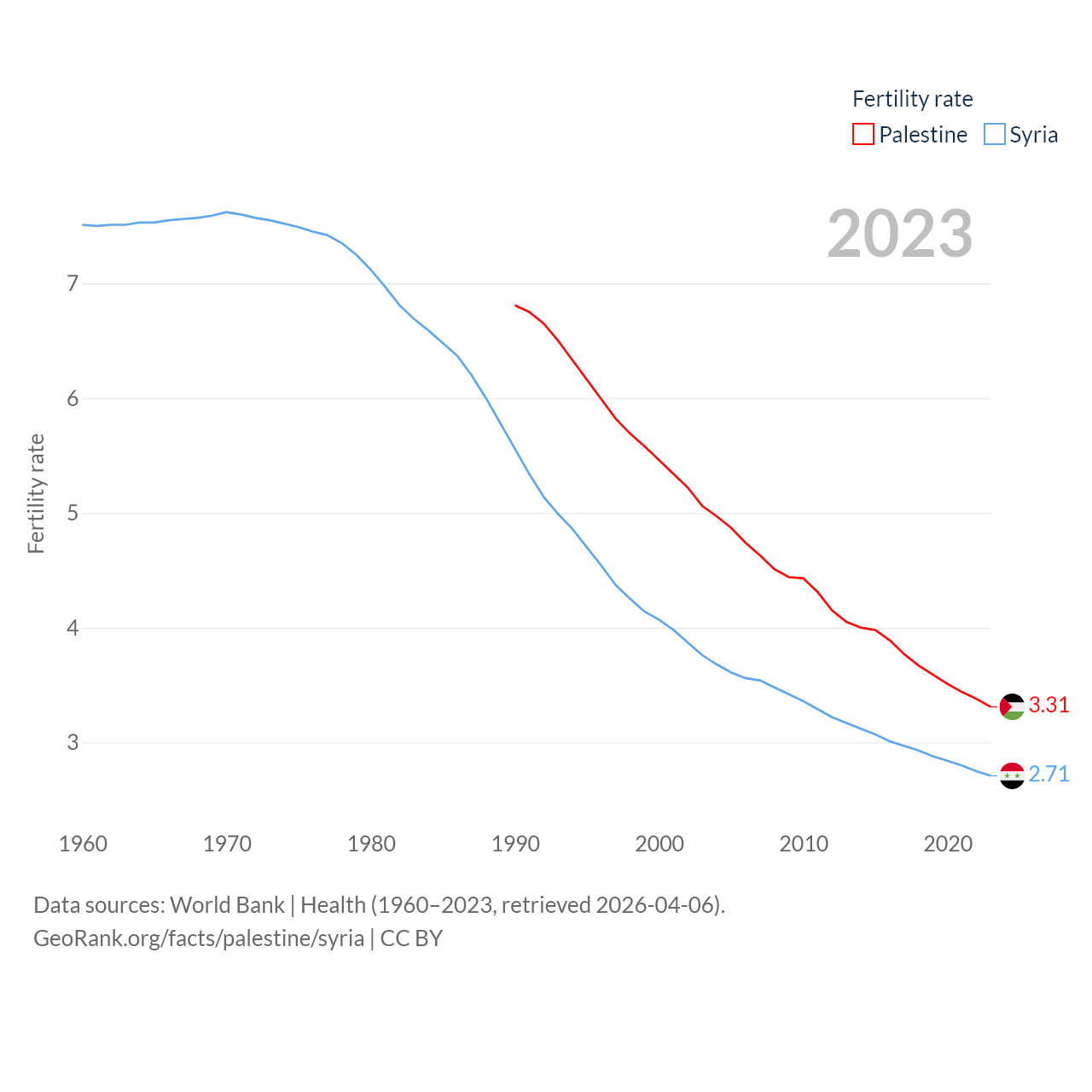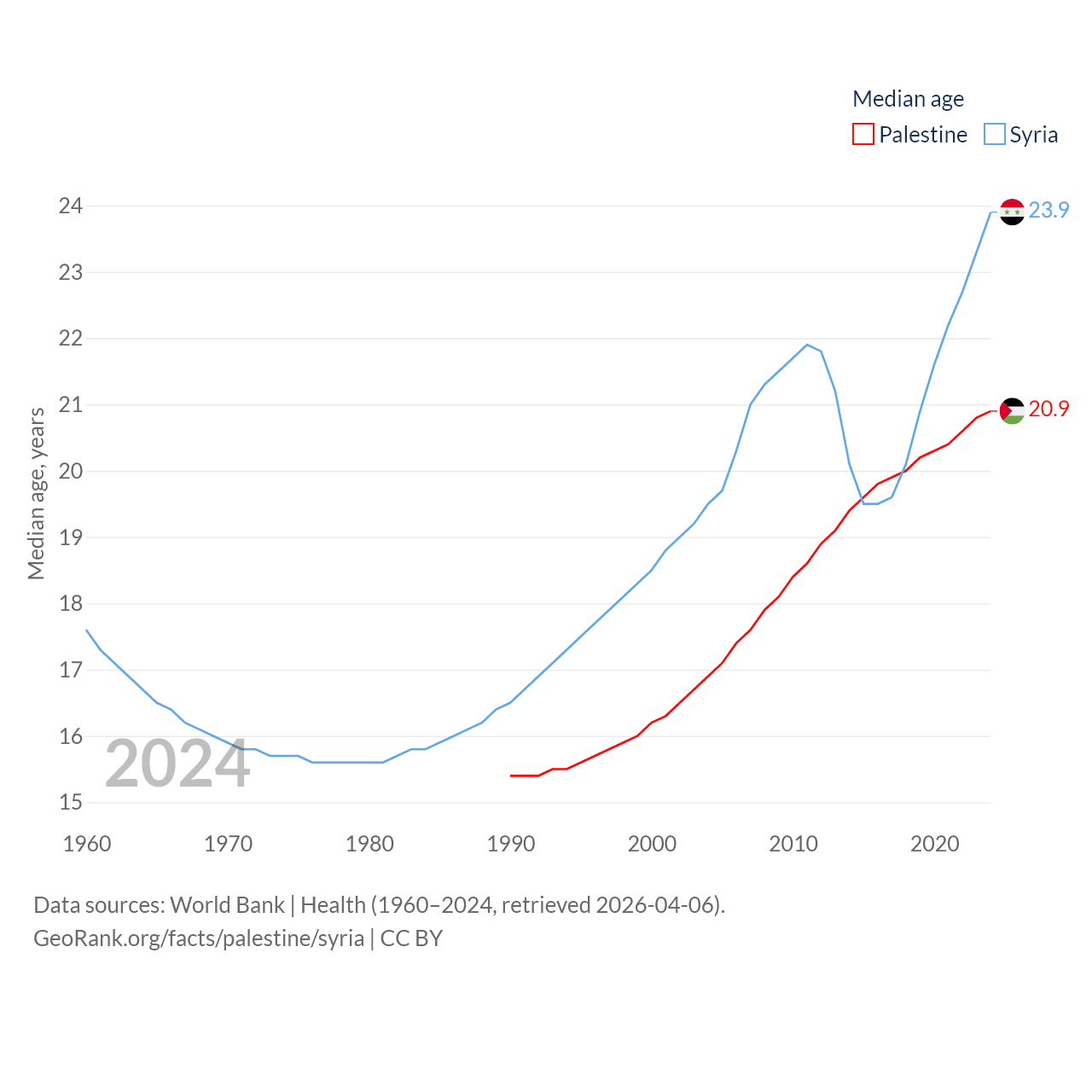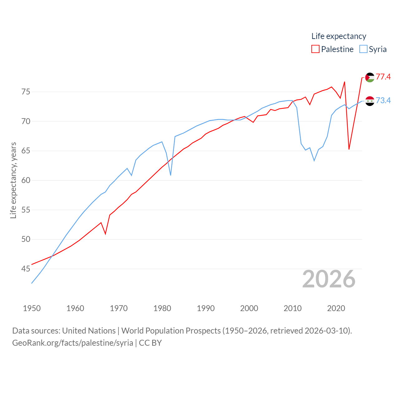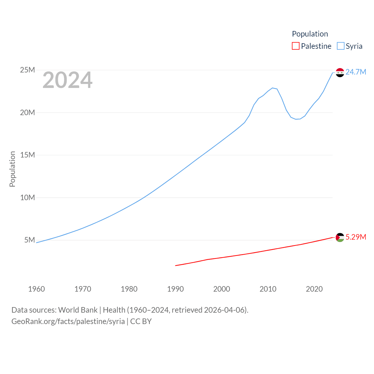 Palestine has a population of 5.29M (ranked 122/197), compared with 24.7M in Syria (ranked 57/197). Palestine's land area is 2,326 sq mi versus 70,900 sq mi for Syria (ranked 164th vs. 87th).