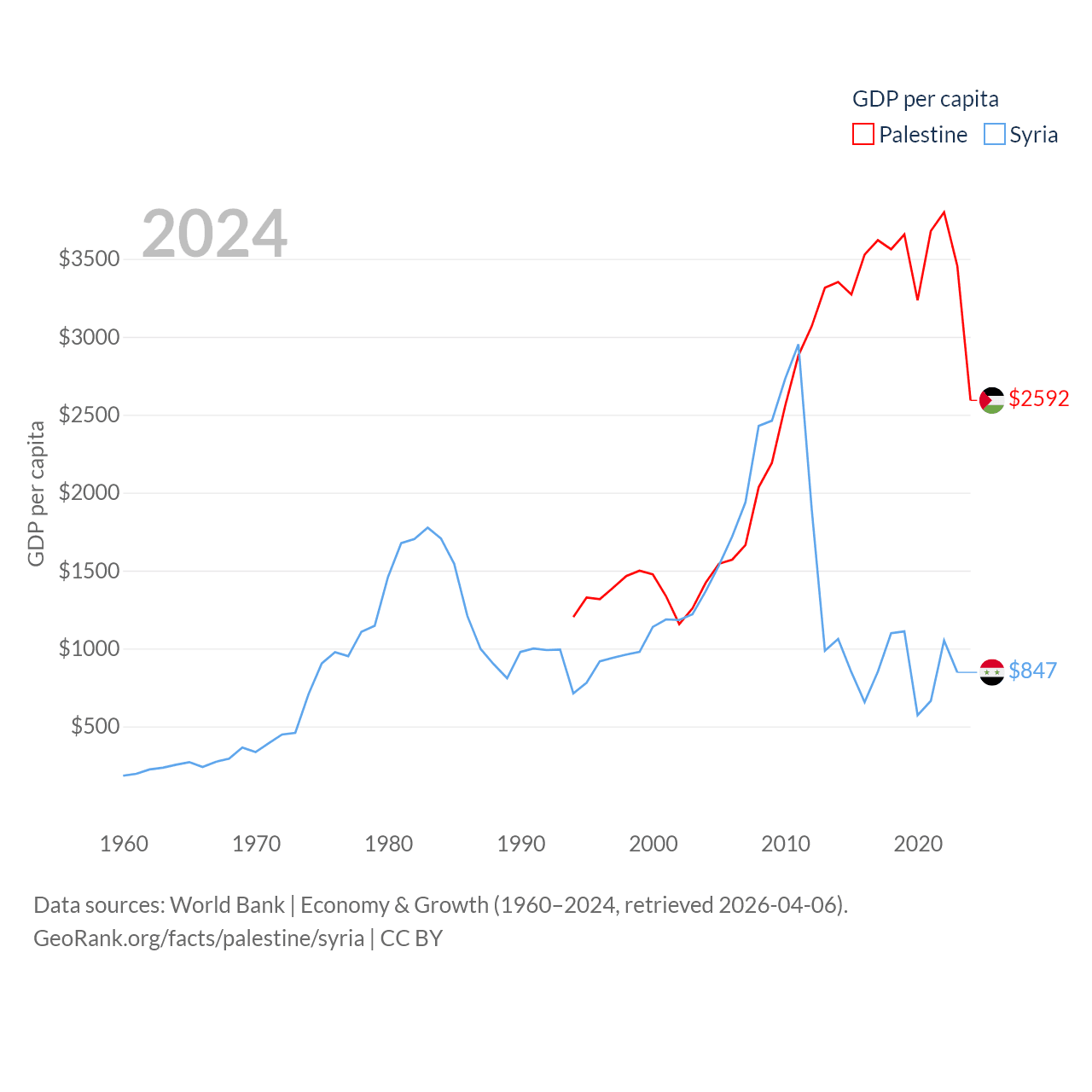 By GDP, Palestine ranks 146/197 ($13.7B) and Syria ranks 129/197 ($20B). By GDP per capita, Palestine ranks 147/197 ($2,592), while Syria ranks 185/197 ($847).