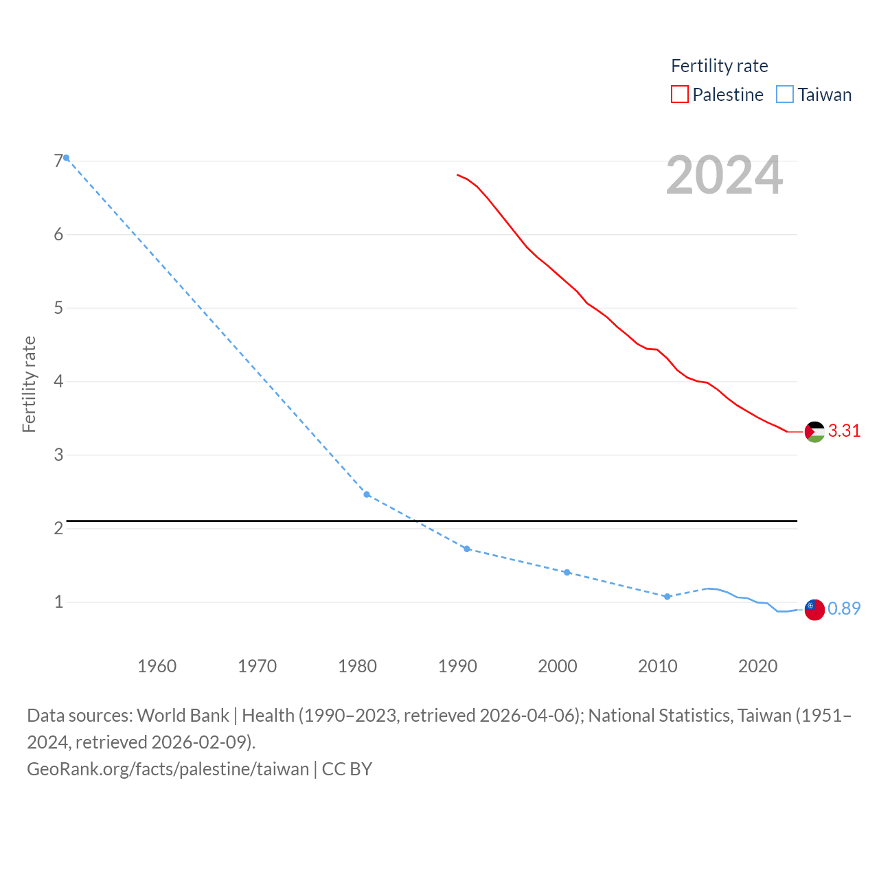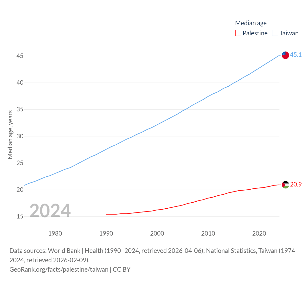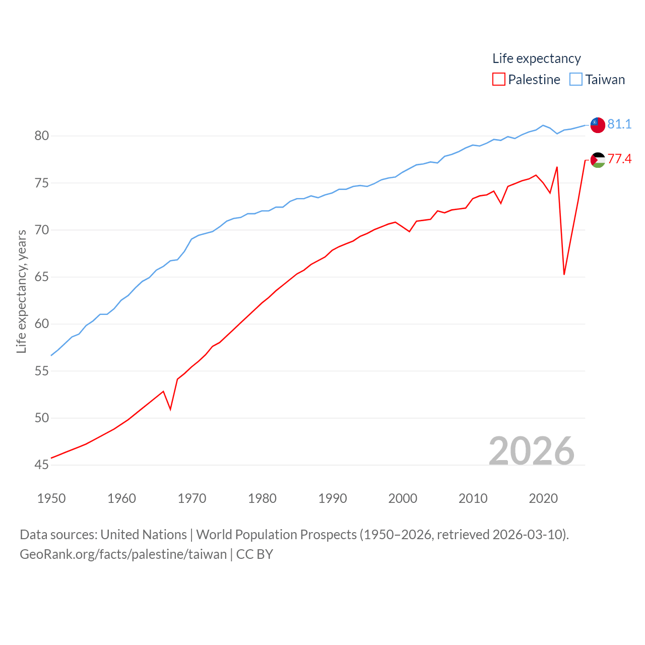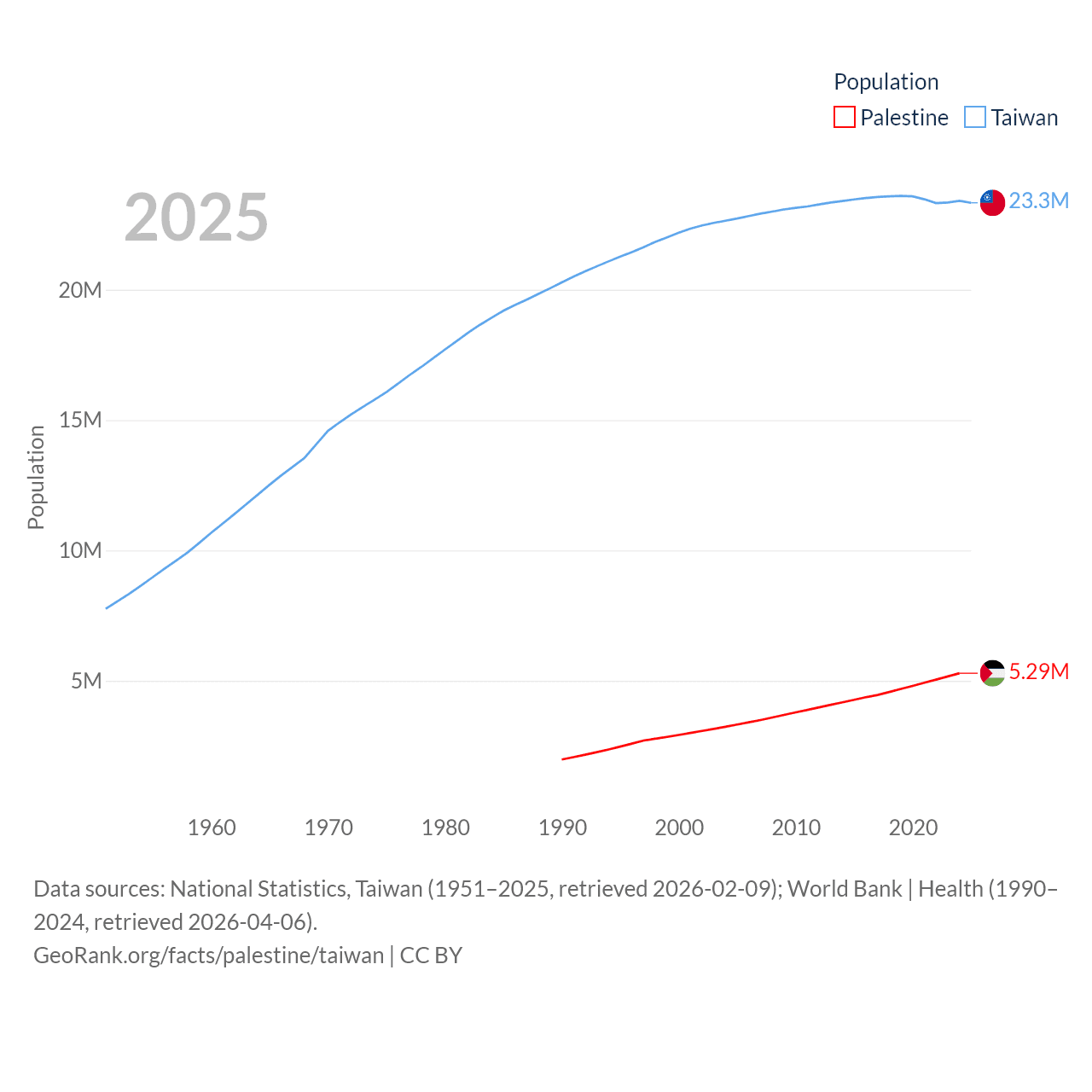 Palestine has a population of 5.29M (ranked 122/197), compared with 23.3M in Taiwan (ranked 60/197). Palestine's land area is 2,326 sq mi versus 13,976 sq mi for Taiwan (ranked 164th vs. 133rd).