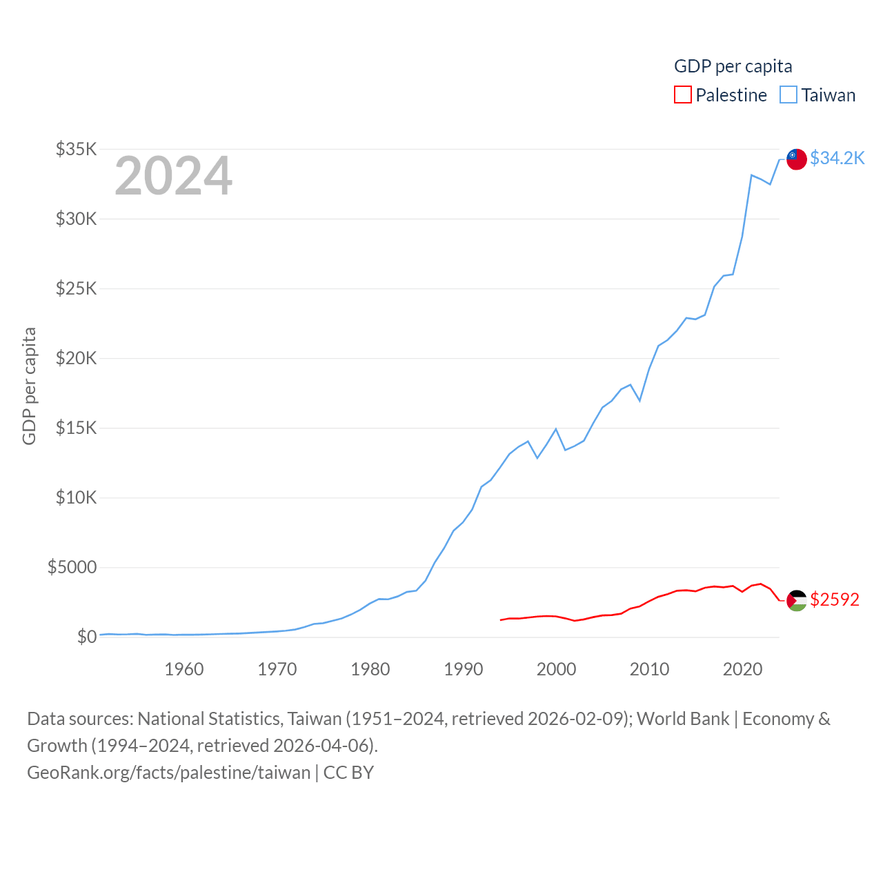 By GDP, Palestine ranks 146/197 ($13.7B) and Taiwan ranks 22/197 ($802B). By GDP per capita, Palestine ranks 147/197 ($2,592), while Taiwan ranks 35/197 ($34,238).