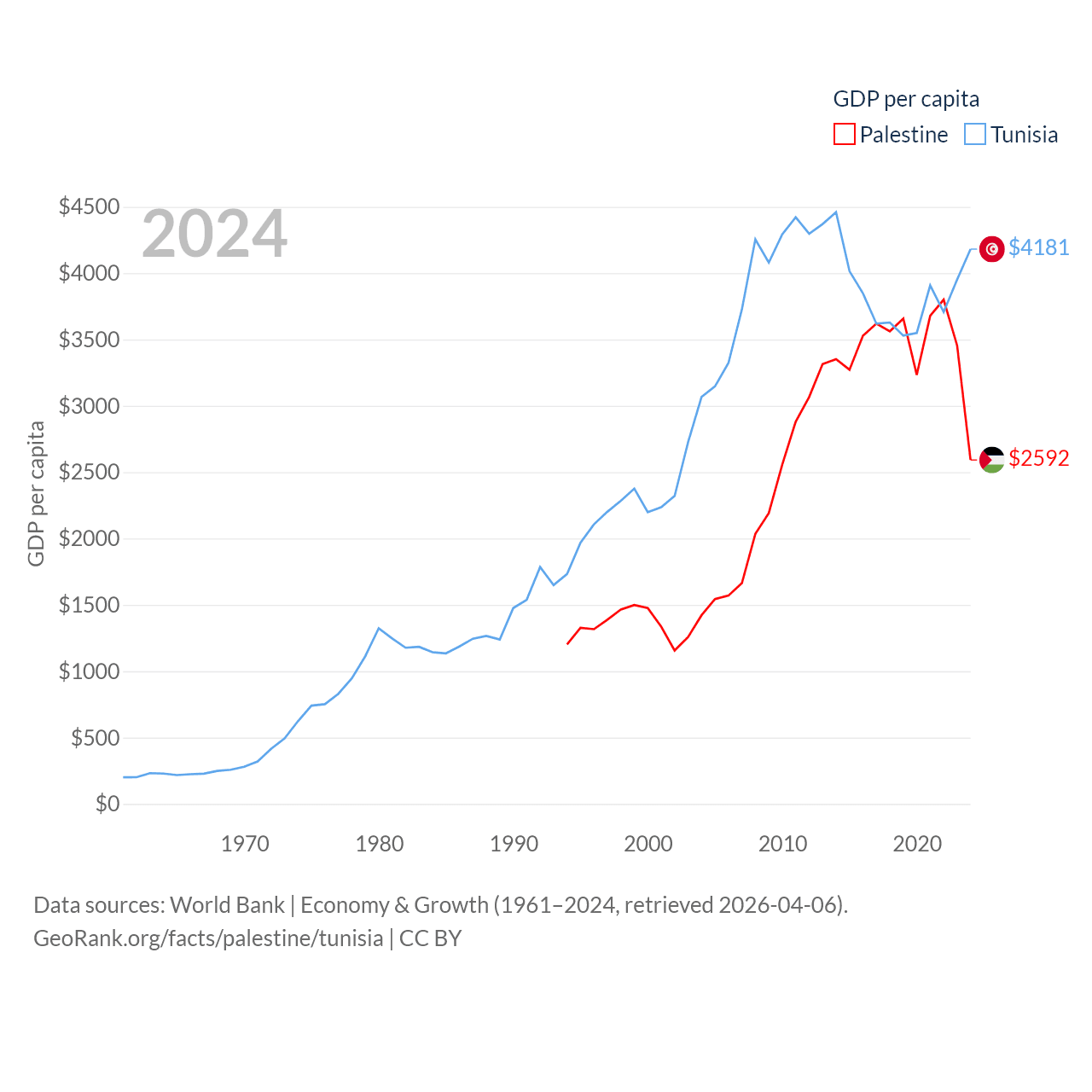 By GDP, Palestine ranks 146/197 ($13.7B) and Tunisia ranks 93/197 ($51.3B). By GDP per capita, Palestine ranks 147/197 ($2,592), while Tunisia ranks 129/197 ($4,181).