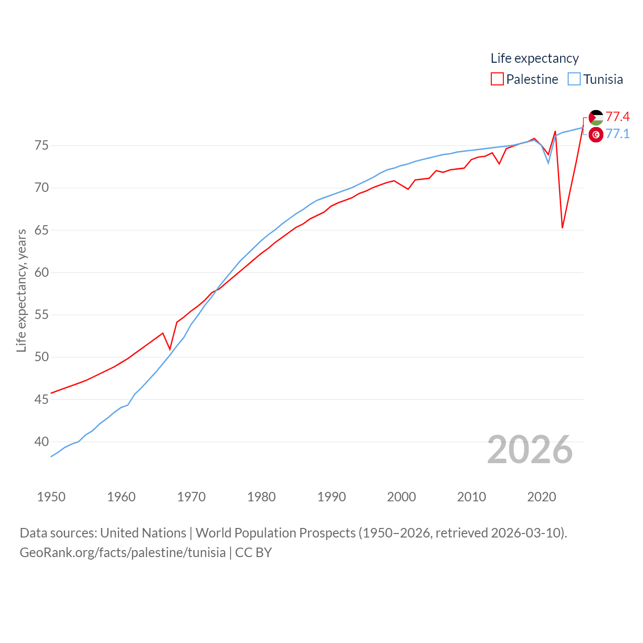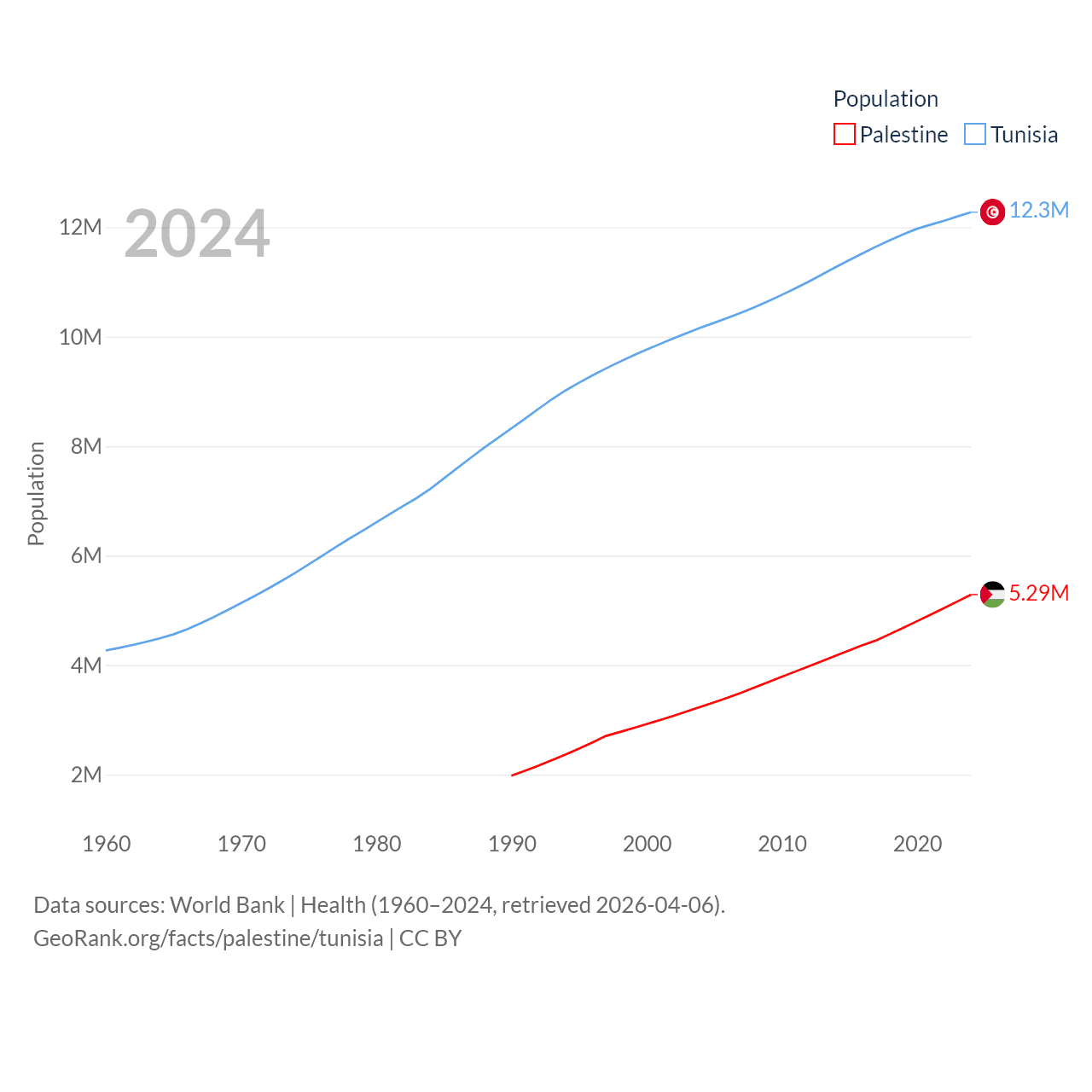 Palestine has a population of 5.29M (ranked 122/197), compared with 12.3M in Tunisia (ranked 80/197). Palestine's land area is 2,326 sq mi versus 59,985 sq mi for Tunisia (ranked 164th vs. 91st).