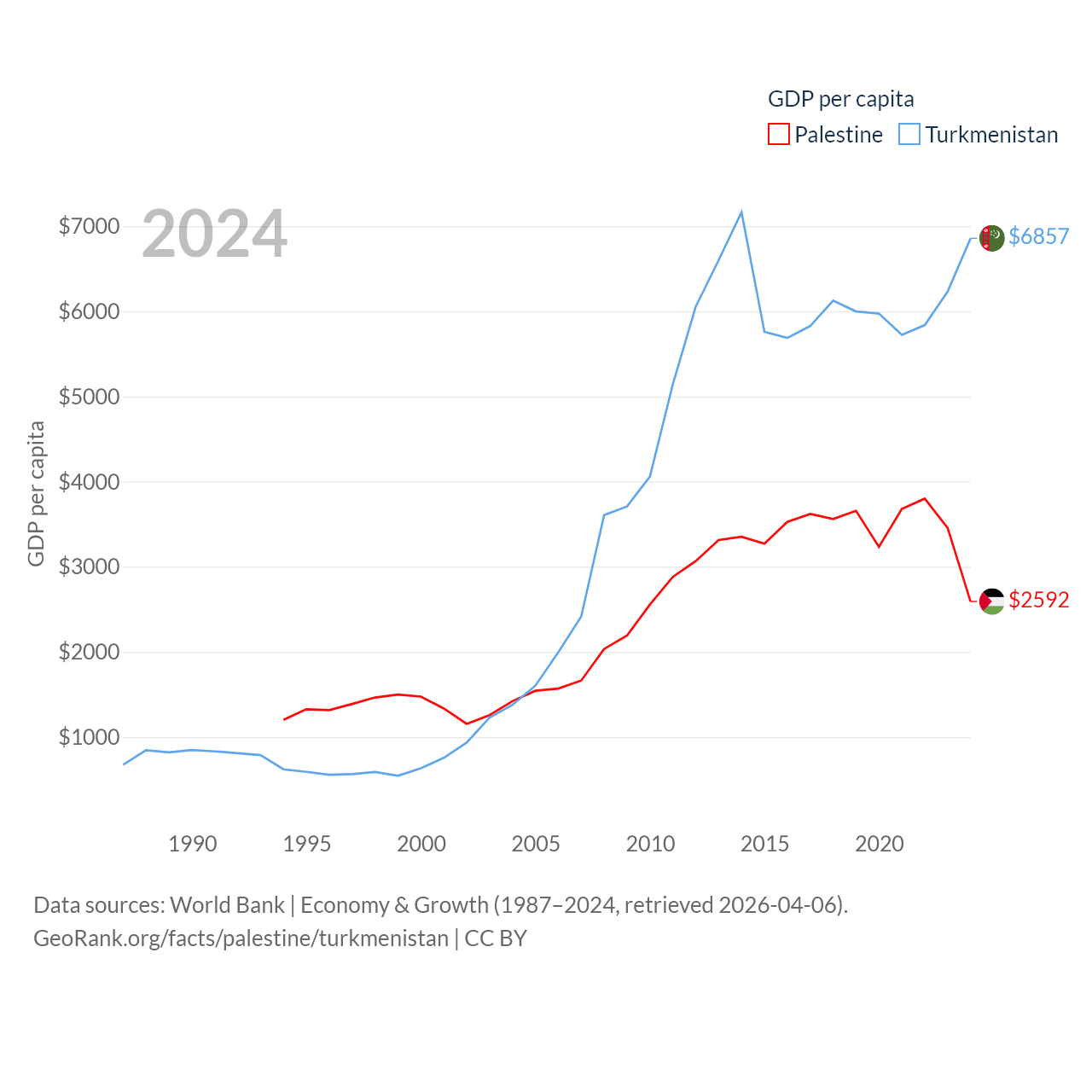 By GDP, Palestine ranks 146/197 ($13.7B) and Turkmenistan ranks 92/197 ($51.4B). By GDP per capita, Palestine ranks 147/197 ($2,592), while Turkmenistan ranks 104/197 ($6,857).
