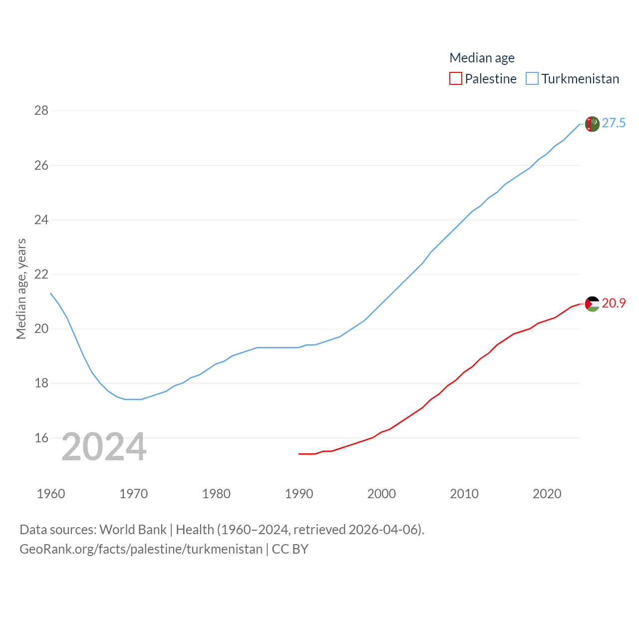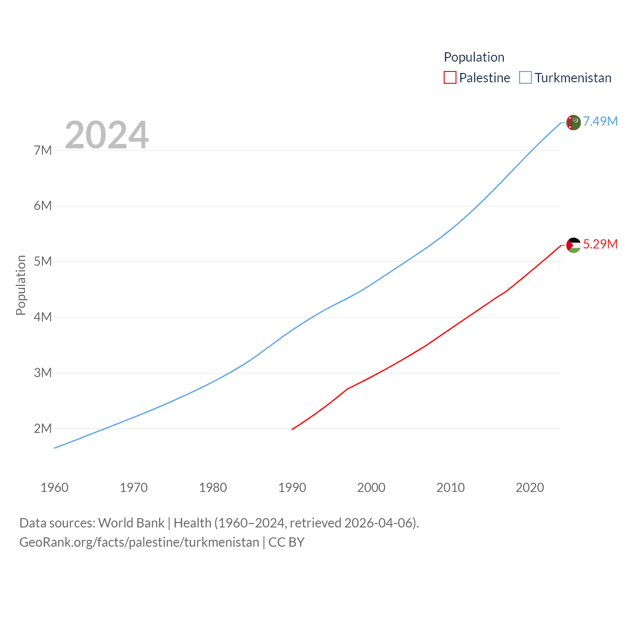 Palestine has a population of 5.29M (ranked 122/197), compared with 7.49M in Turkmenistan (ranked 104/197). Palestine's land area is 2,326 sq mi versus 181,441 sq mi for Turkmenistan (ranked 164th vs. 53rd).