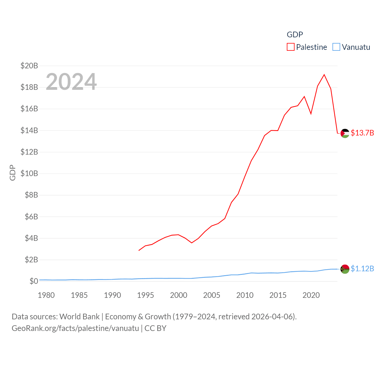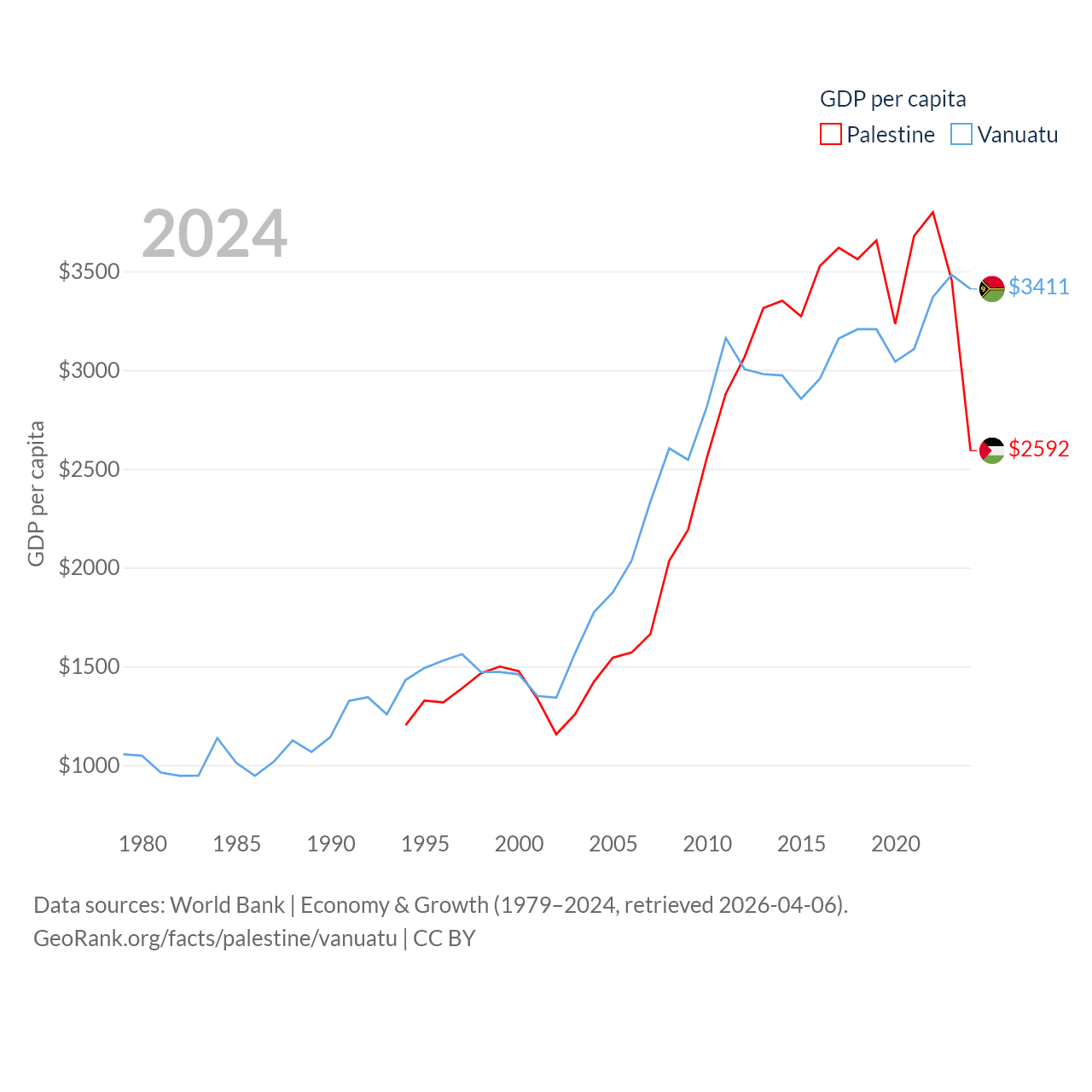 By GDP, Palestine ranks 146/197 ($13.7B) and Vanuatu ranks 188/197 ($1.12B). By GDP per capita, Palestine ranks 147/197 ($2,592), while Vanuatu ranks 137/197 ($3,411).