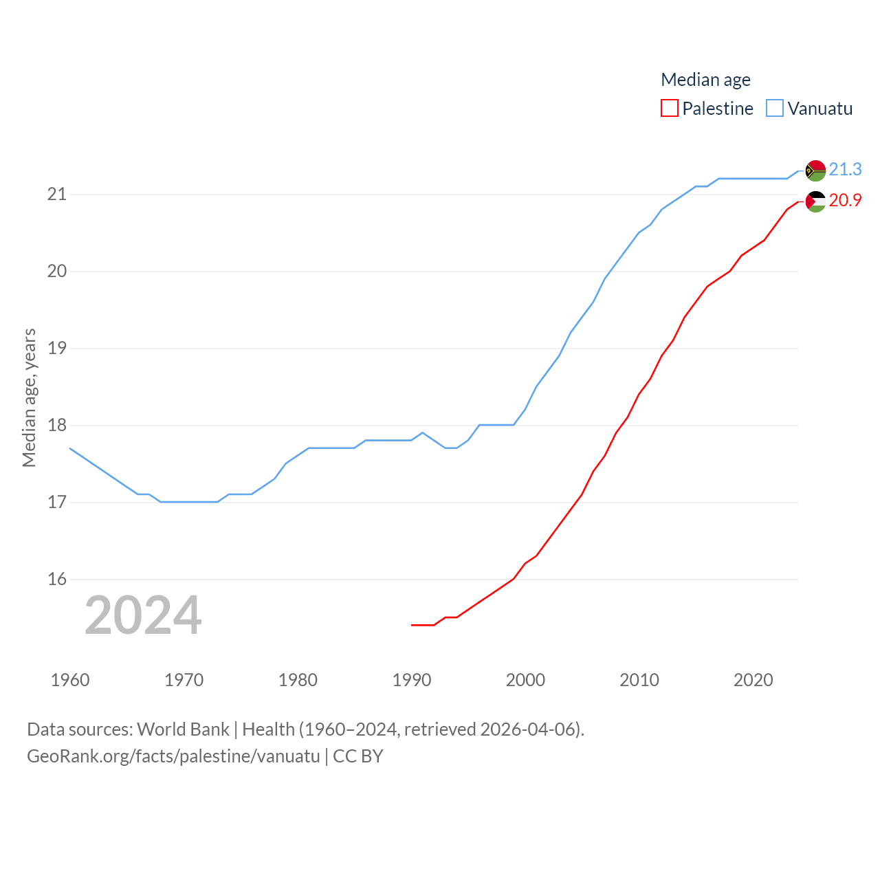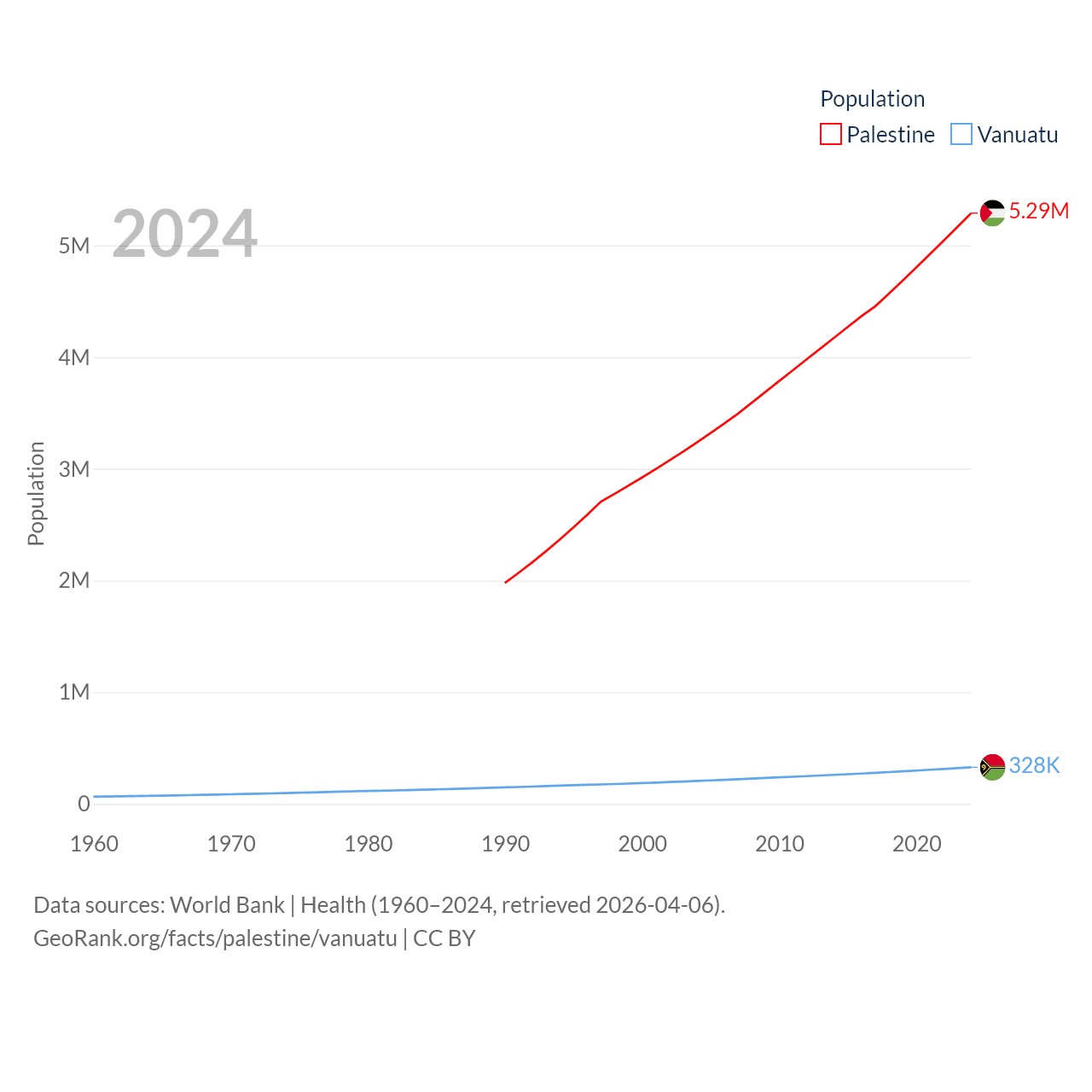 Palestine has a population of 5.29M (ranked 122/197), compared with 328K in Vanuatu (ranked 174/197). Palestine's land area is 2,326 sq mi versus 4,707 sq mi for Vanuatu (ranked 164th vs. 157th).