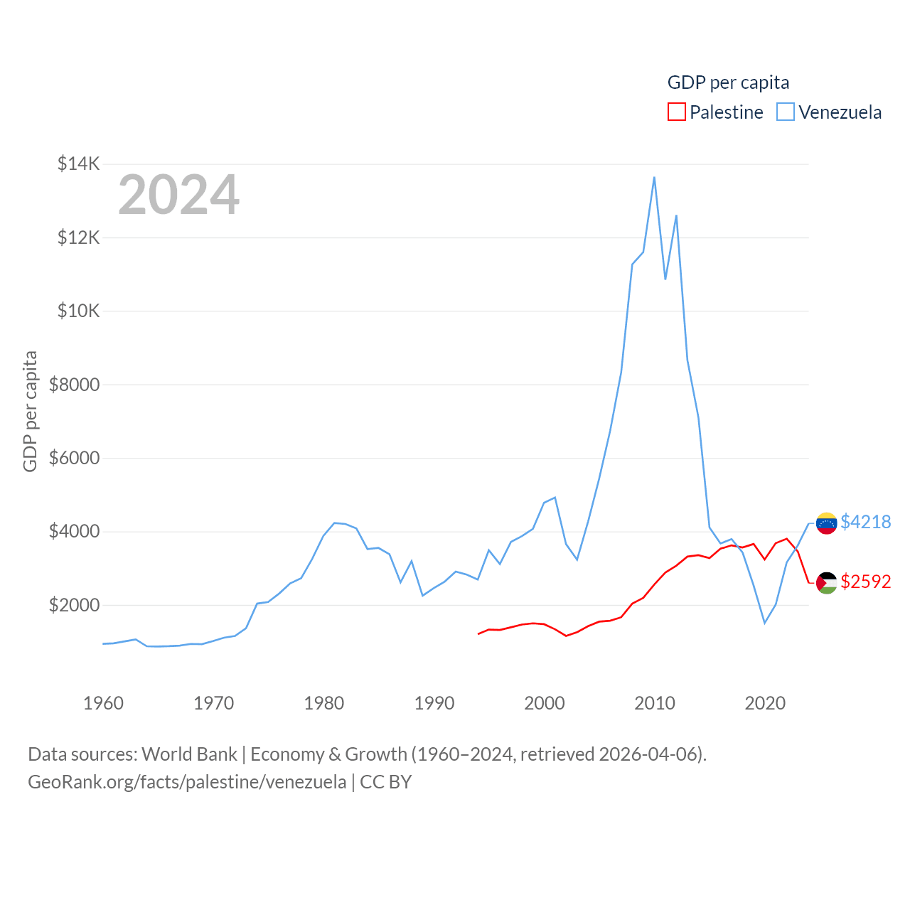 By GDP, Palestine ranks 146/197 ($13.7B) and Venezuela ranks 65/197 ($120B). By GDP per capita, Palestine ranks 147/197 ($2,592), while Venezuela ranks 128/197 ($4,218).
