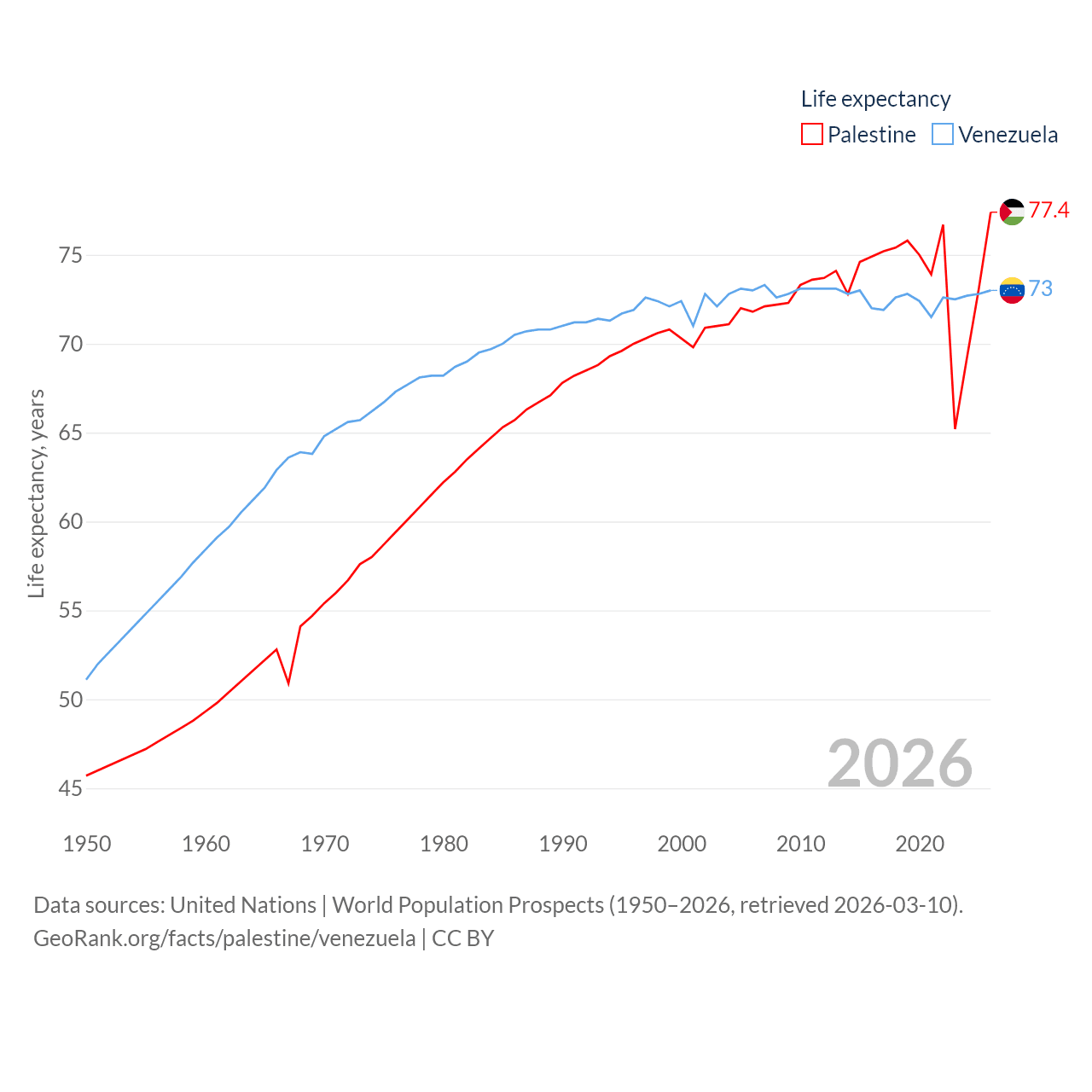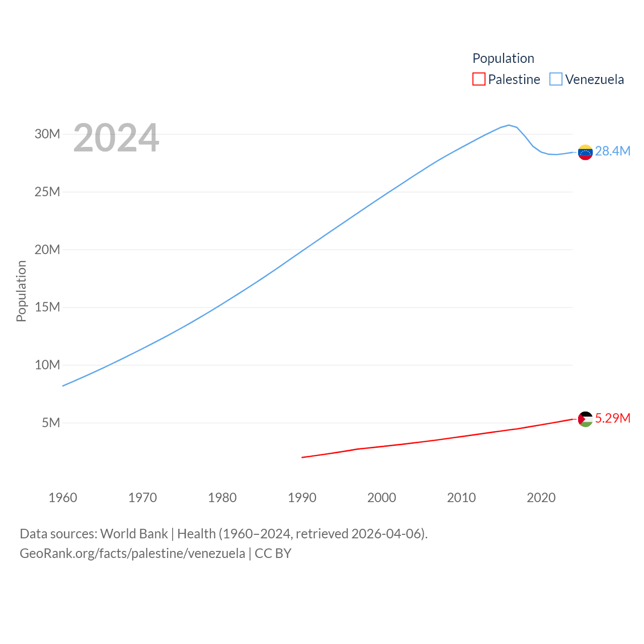 Palestine has a population of 5.29M (ranked 122/197), compared with 28.4M in Venezuela (ranked 53/197). Palestine's land area is 2,326 sq mi versus 340,561 sq mi for Venezuela (ranked 164th vs. 32nd).