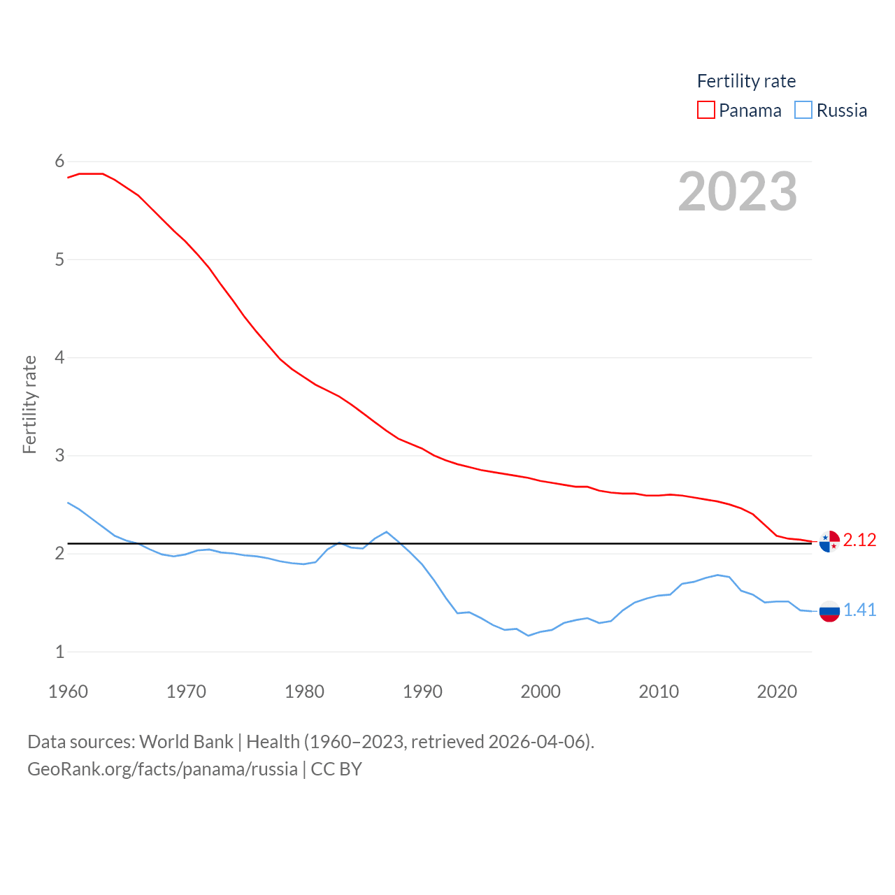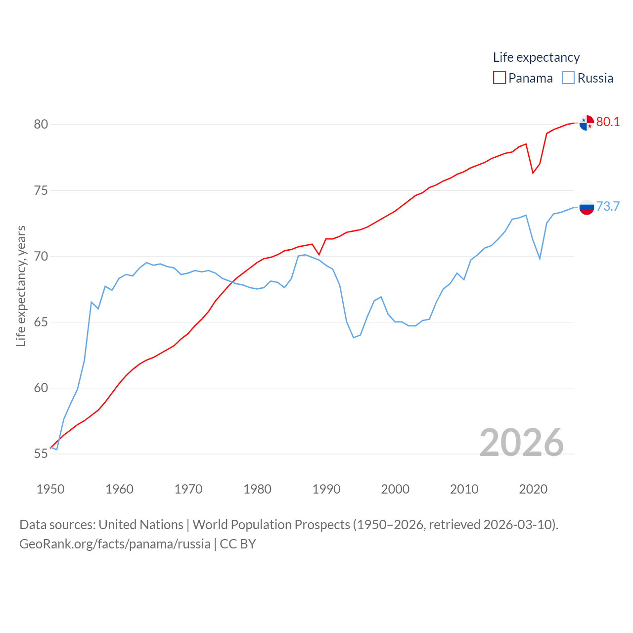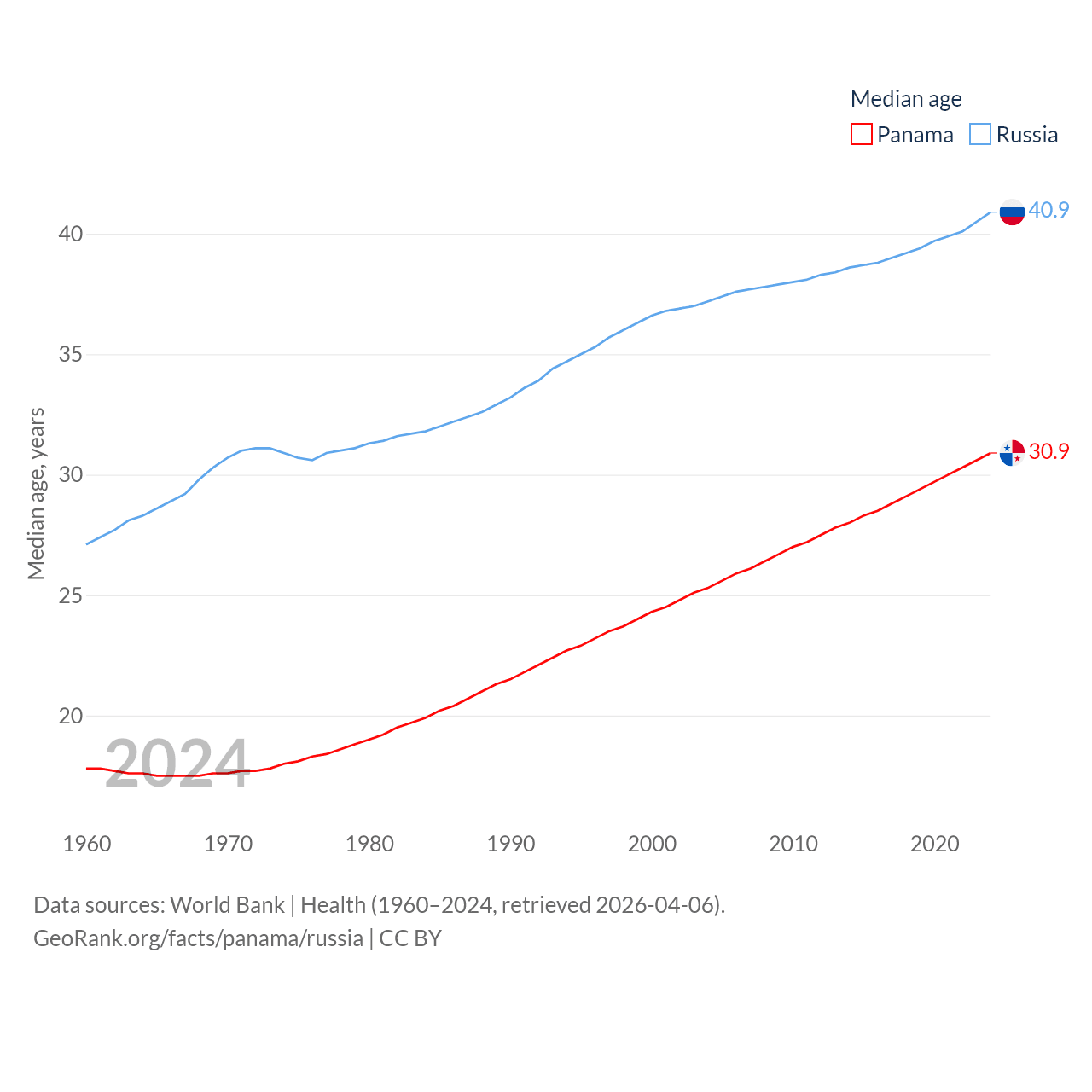 Panama has a population of 4.52M (ranked 128/197), compared with 144M in Russia (ranked 9/197). Panama's land area is 28,641 sq mi versus 6,323,145 sq mi for Russia (ranked 115th vs. 1st).