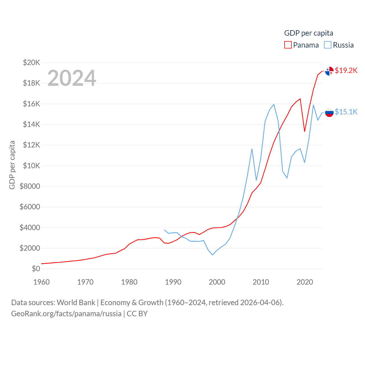 By GDP, Panama ranks 78/197 ($86.5B) and Russia ranks 11/197 ($2.17T). By GDP per capita, Panama ranks 60/197 ($19,161), while Russia ranks 68/197 ($15,145).