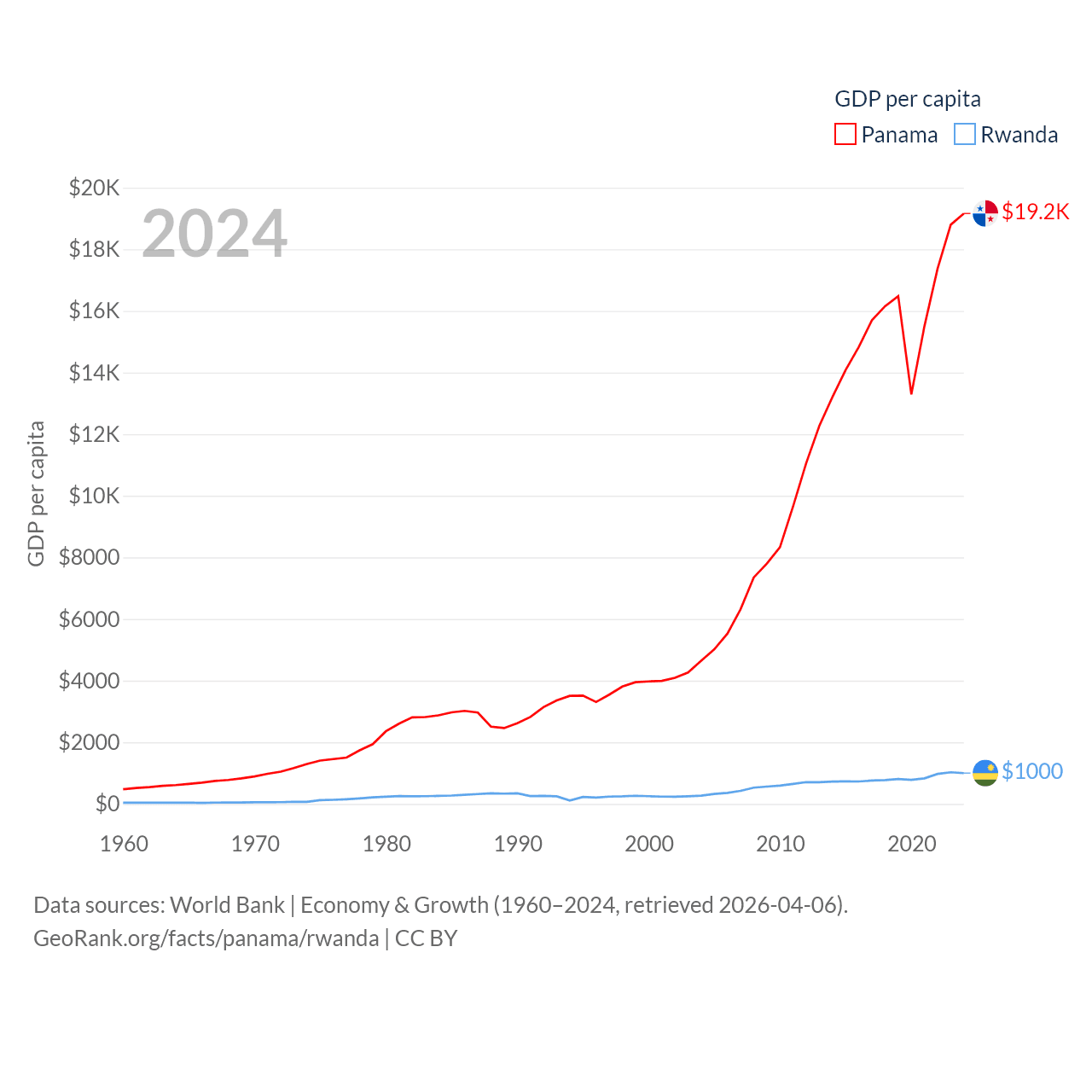 By GDP, Panama ranks 78/197 ($86.5B) and Rwanda ranks 144/197 ($14.3B). By GDP per capita, Panama ranks 60/197 ($19,161), while Rwanda ranks 178/197 ($1,000).