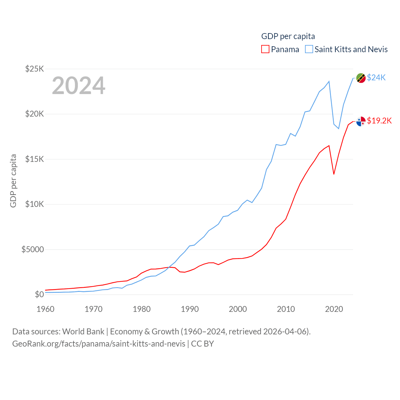 By GDP, Panama ranks 78/197 ($86.5B) and Saint Kitts and Nevis ranks 187/197 ($1.12B). By GDP per capita, Panama ranks 60/197 ($19,161), while Saint Kitts and Nevis ranks 51/197 ($23,961).