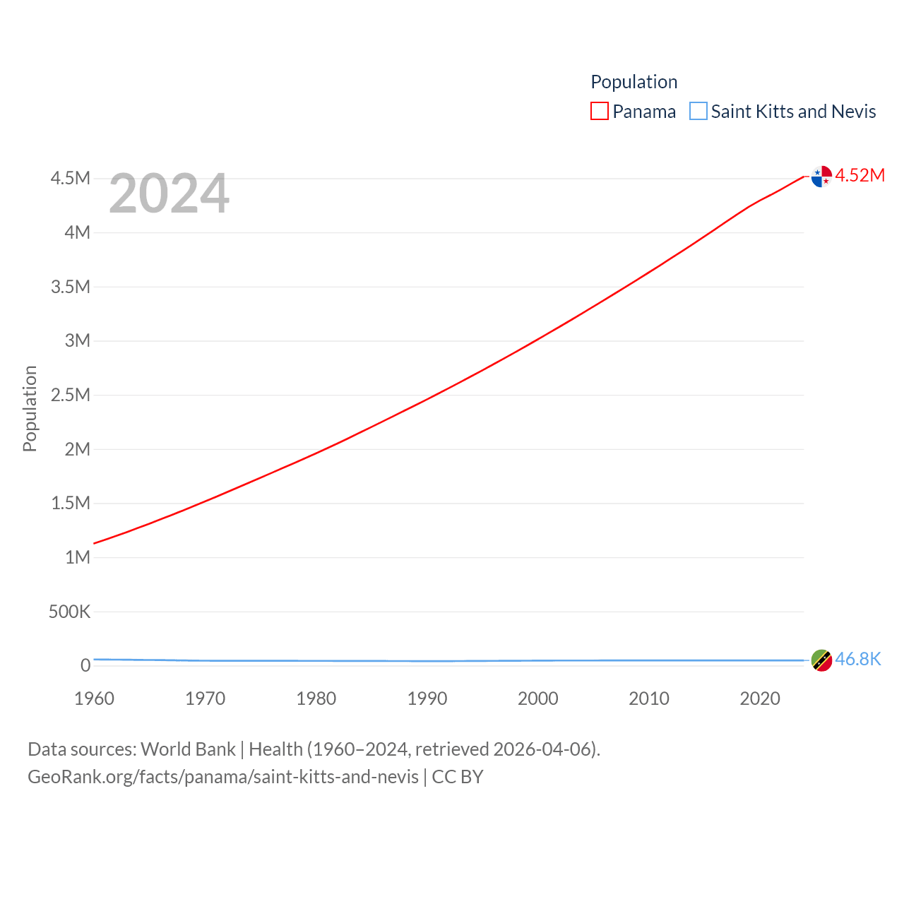 Panama has a population of 4.52M (ranked 128/197), compared with 46.8K in Saint Kitts and Nevis (ranked 189/197). Panama's land area is 28,641 sq mi versus 100.4 sq mi for Saint Kitts and Nevis (ranked 115th vs. 189th).