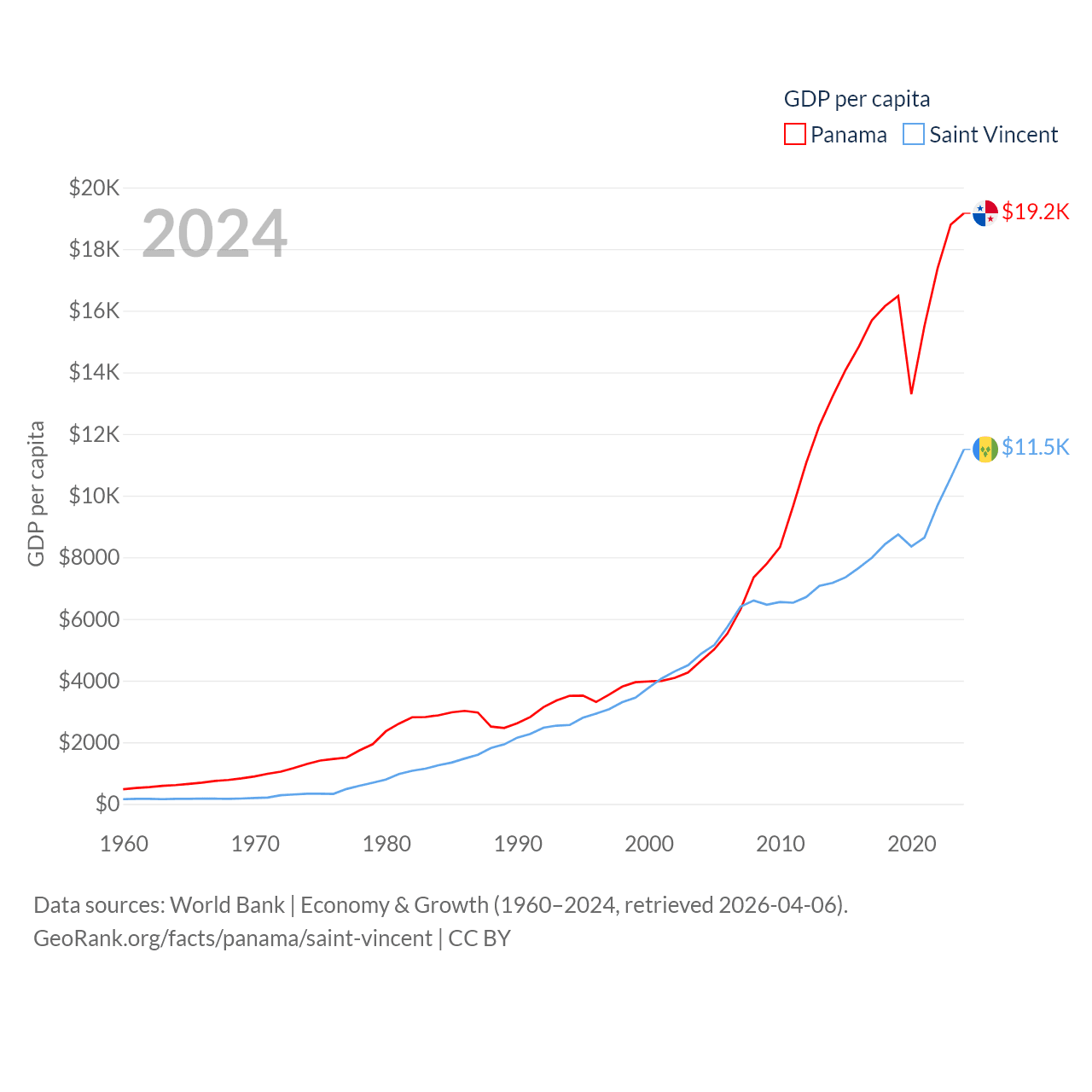 By GDP, Panama ranks 78/197 ($86.5B) and Saint Vincent ranks 186/197 ($1.16B). By GDP per capita, Panama ranks 60/197 ($19,161), while Saint Vincent ranks 81/197 ($11,501).