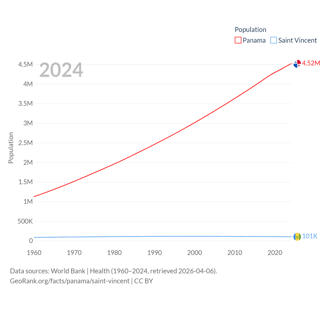 Panama has a population of 4.52M (ranked 128/197), compared with 101K in Saint Vincent (ranked 184/197). Panama's land area is 28,641 sq mi versus 150.6 sq mi for Saint Vincent (ranked 115th vs. 185th).