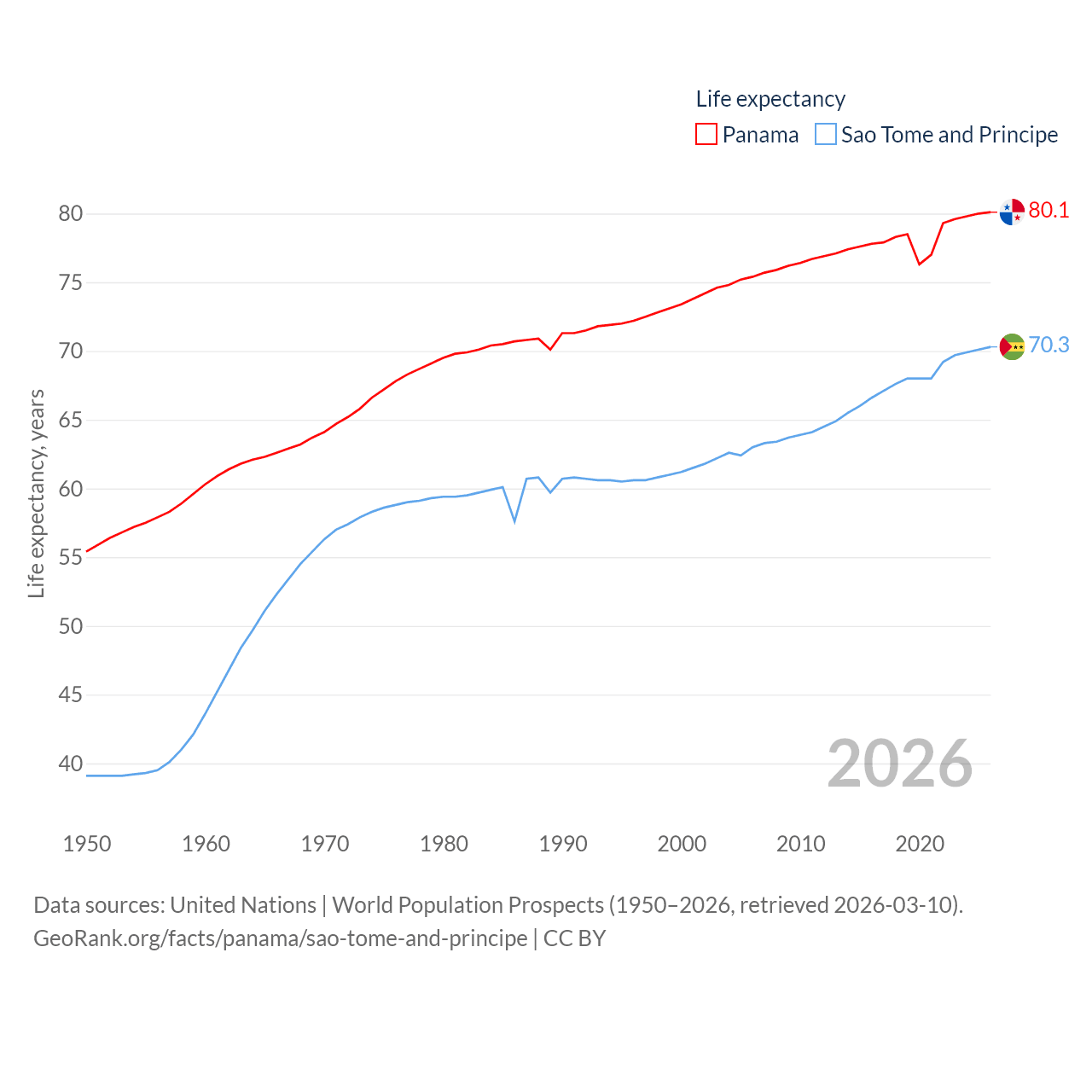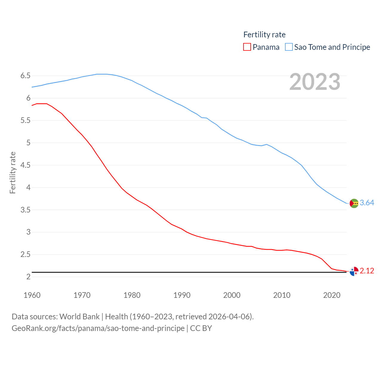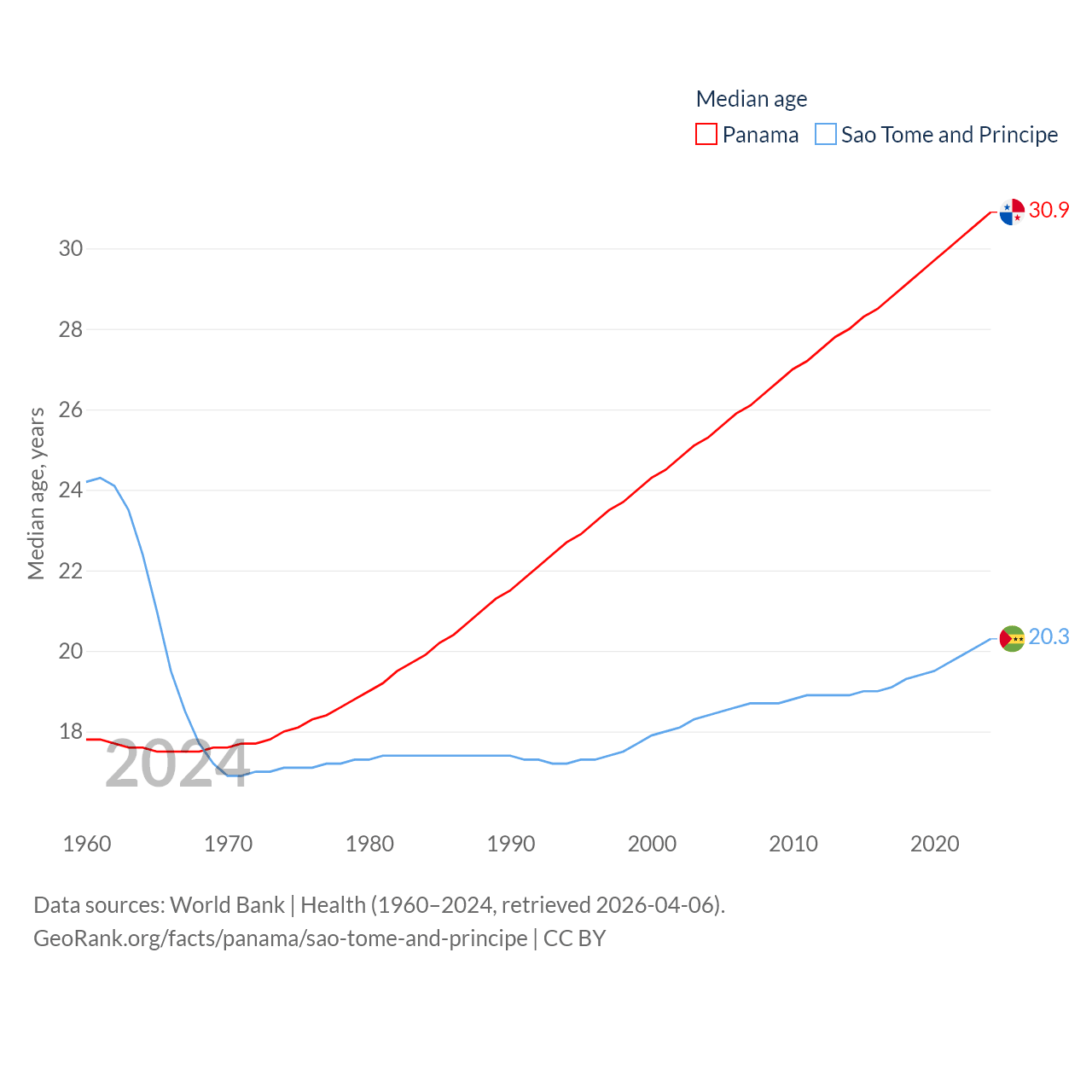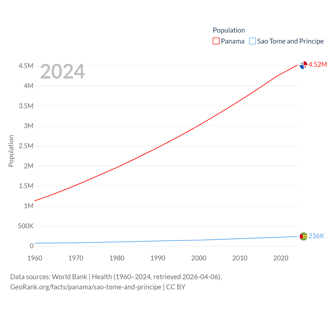 Panama has a population of 4.52M (ranked 128/197), compared with 236K in Sao Tome and Principe (ranked 176/197). Panama's land area is 28,641 sq mi versus 371 sq mi for Sao Tome and Principe (ranked 115th vs. 172nd).