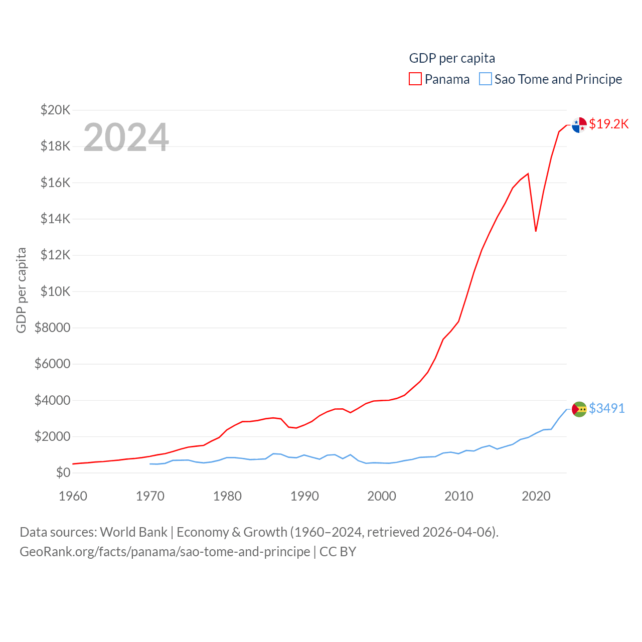 By GDP, Panama ranks 78/197 ($86.5B) and Sao Tome and Principe ranks 189/197 ($822M). By GDP per capita, Panama ranks 60/197 ($19,161), while Sao Tome and Principe ranks 134/197 ($3,491).