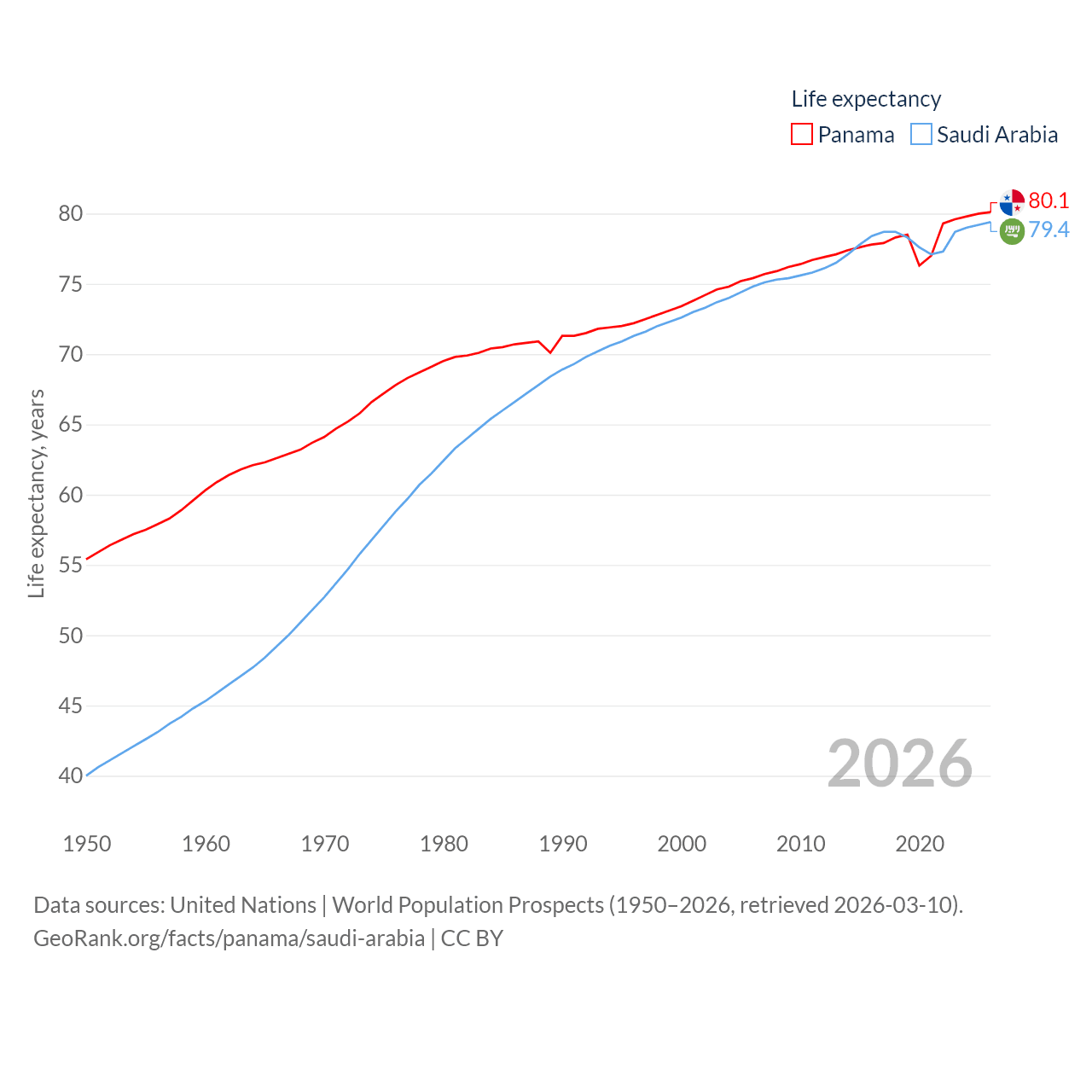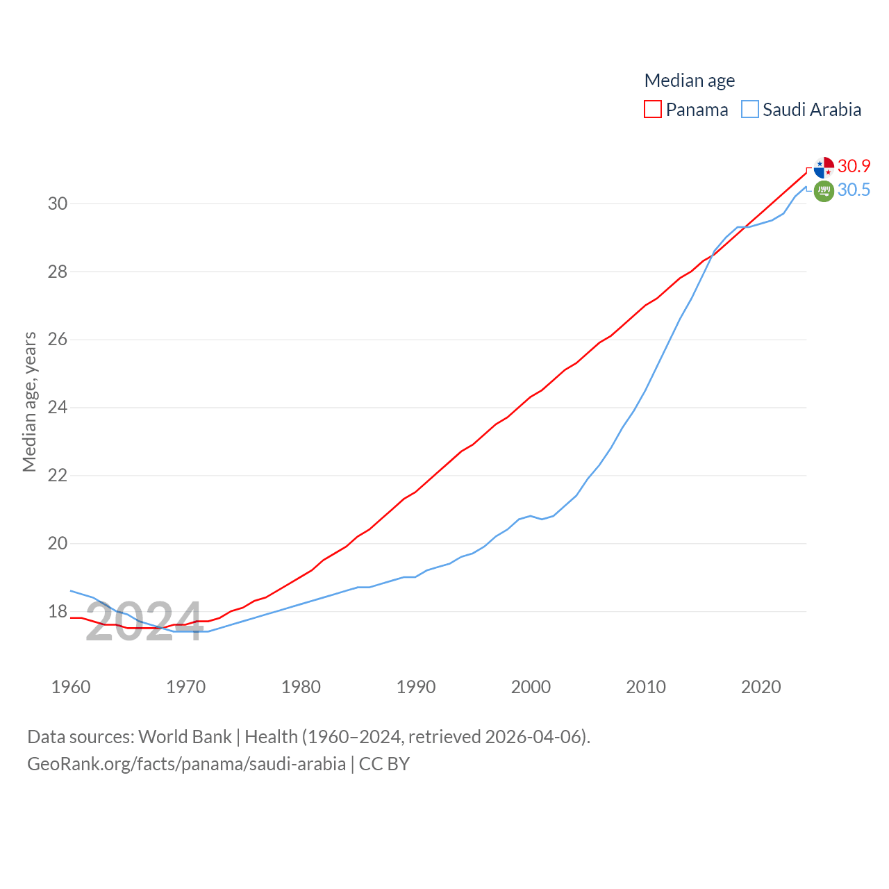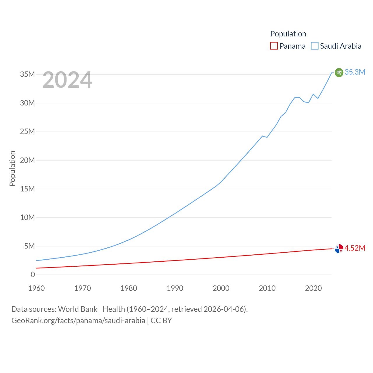 Panama has a population of 4.52M (ranked 128/197), compared with 35.3M in Saudi Arabia (ranked 45/197). Panama's land area is 28,641 sq mi versus 830,000 sq mi for Saudi Arabia (ranked 115th vs. 12th).