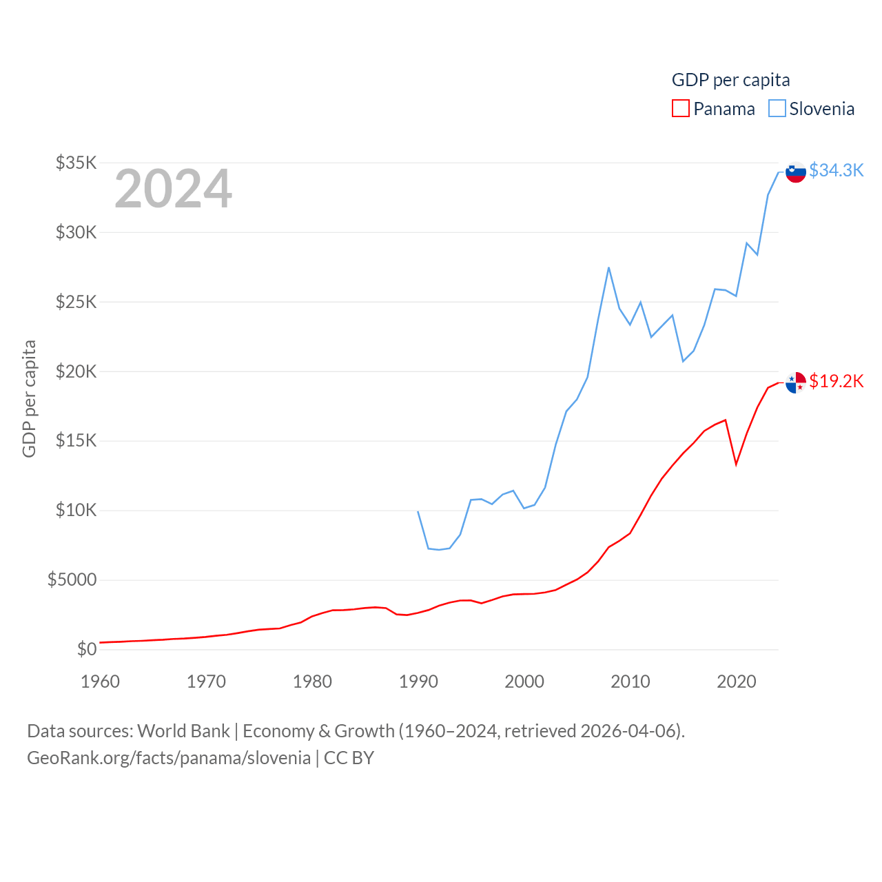By GDP, Panama ranks 78/197 ($86.5B) and Slovenia ranks 86/197 ($73B). By GDP per capita, Panama ranks 60/197 ($19,161), while Slovenia ranks 34/197 ($34,301).