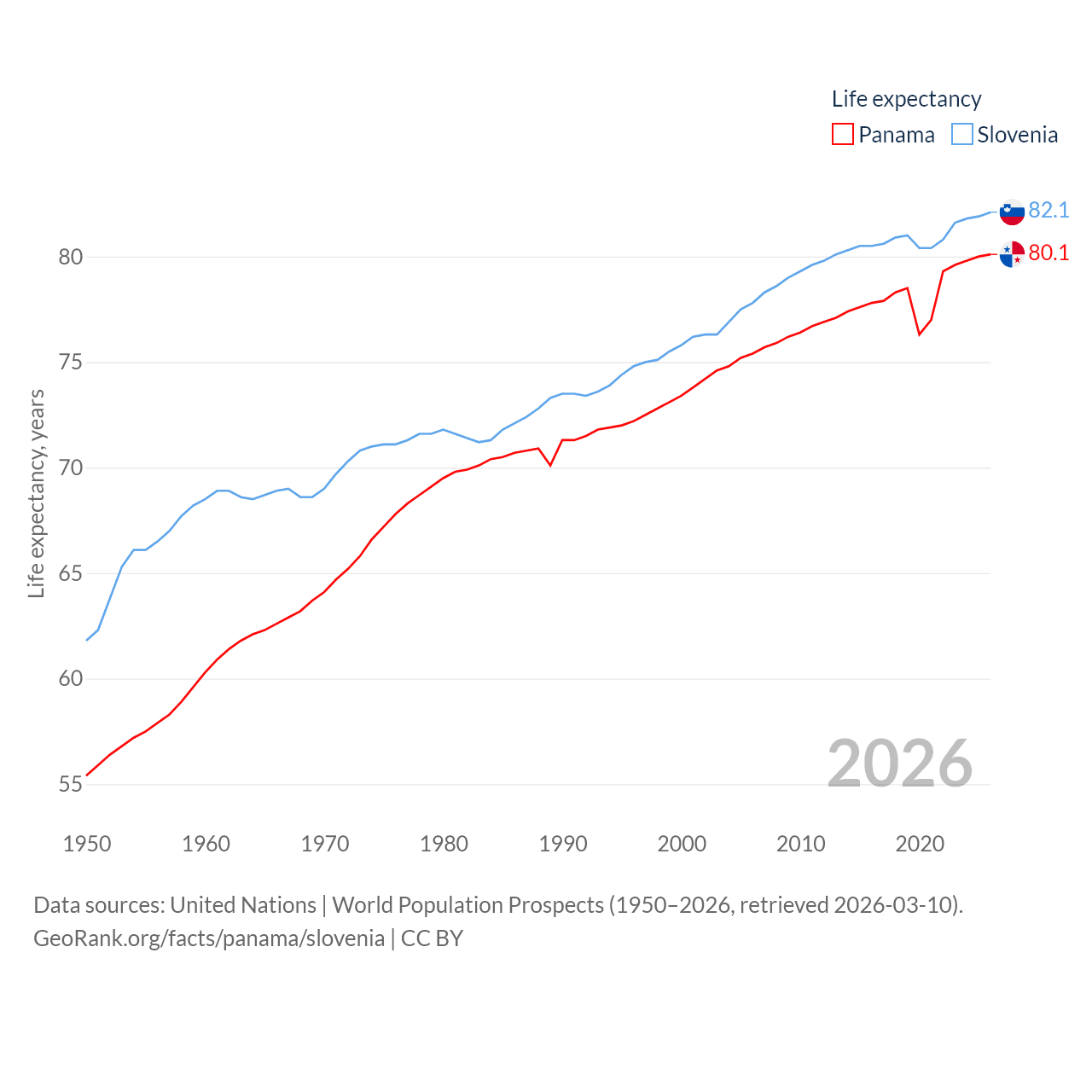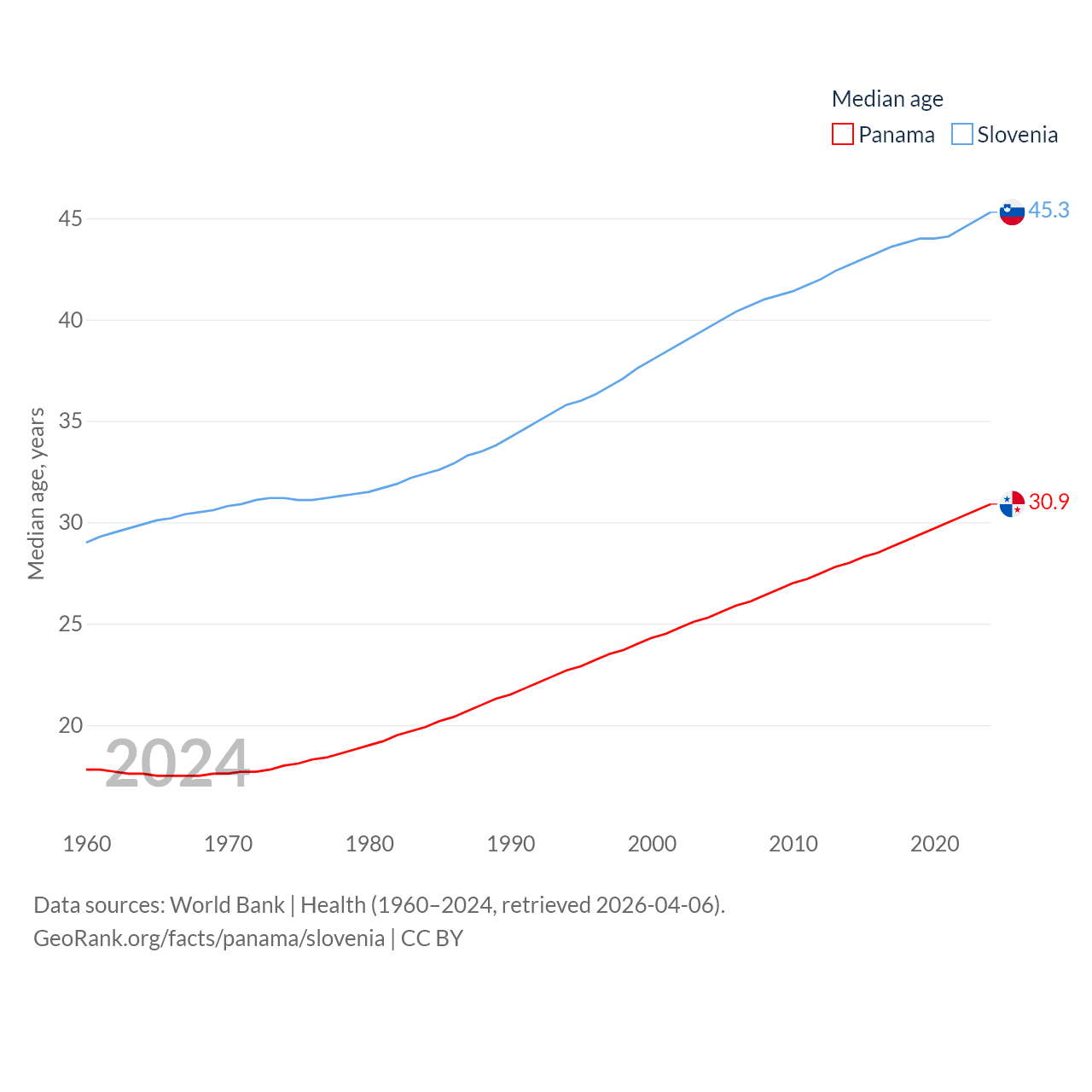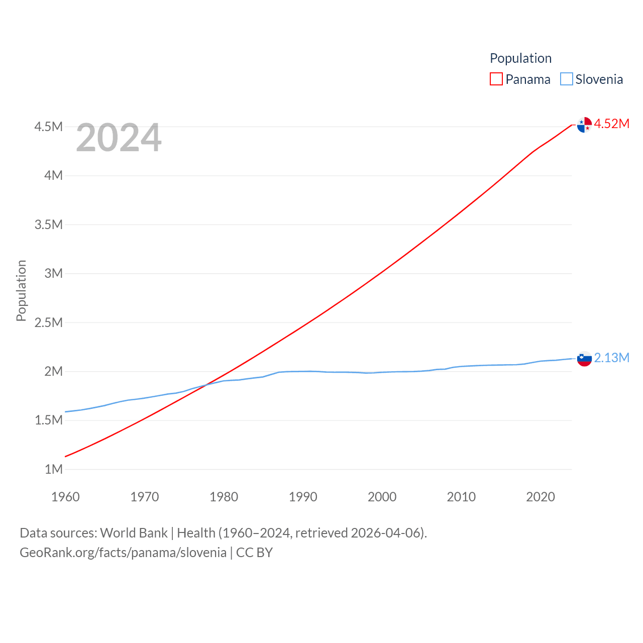 Panama has a population of 4.52M (ranked 128/197), compared with 2.13M in Slovenia (ranked 147/197). Panama's land area is 28,641 sq mi versus 7,774 sq mi for Slovenia (ranked 115th vs. 151st).