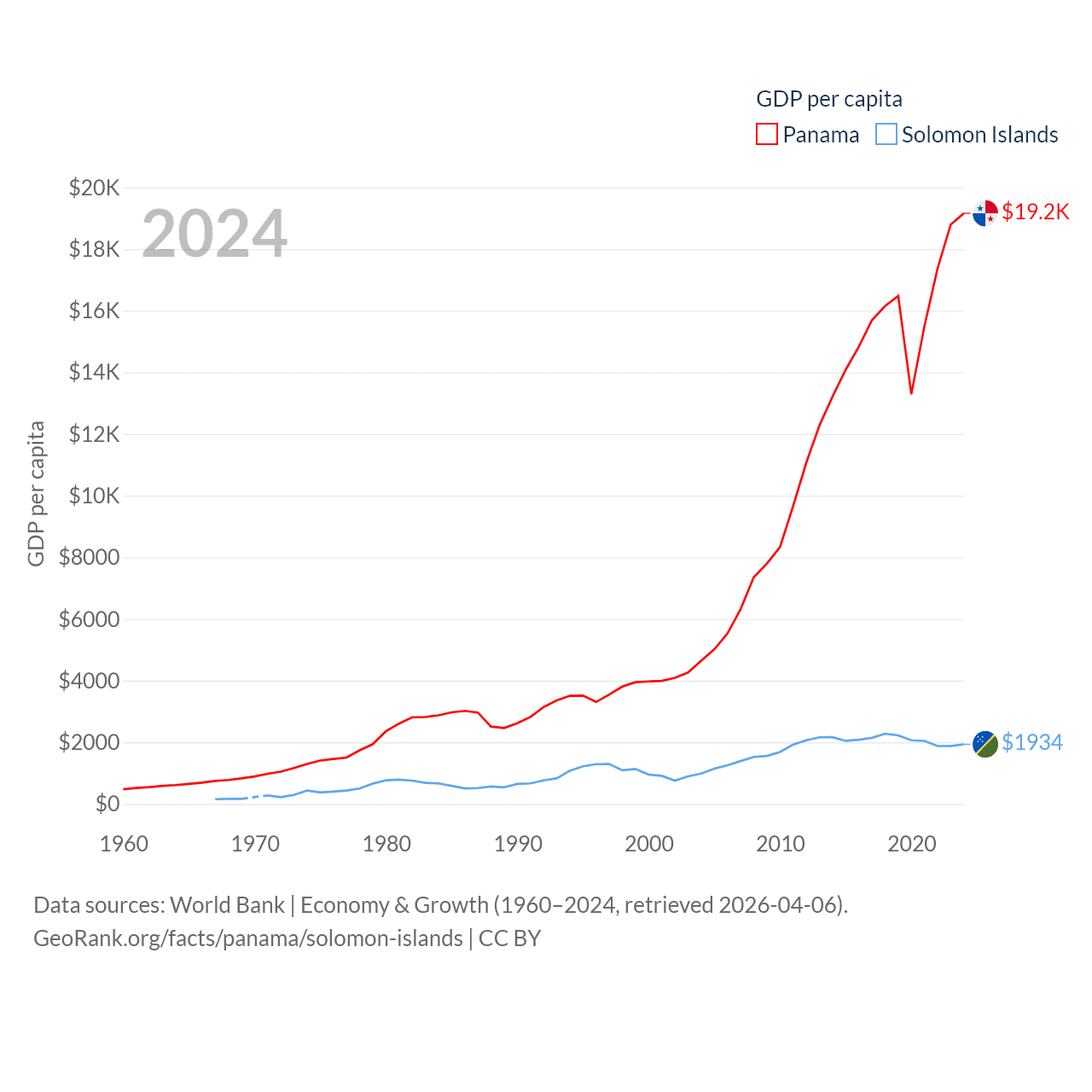 By GDP, Panama ranks 78/197 ($86.5B) and The Solomon Islands ranks 182/197 ($1.58B). By GDP per capita, Panama ranks 60/197 ($19,161), while The Solomon Islands ranks 157/197 ($1,934).