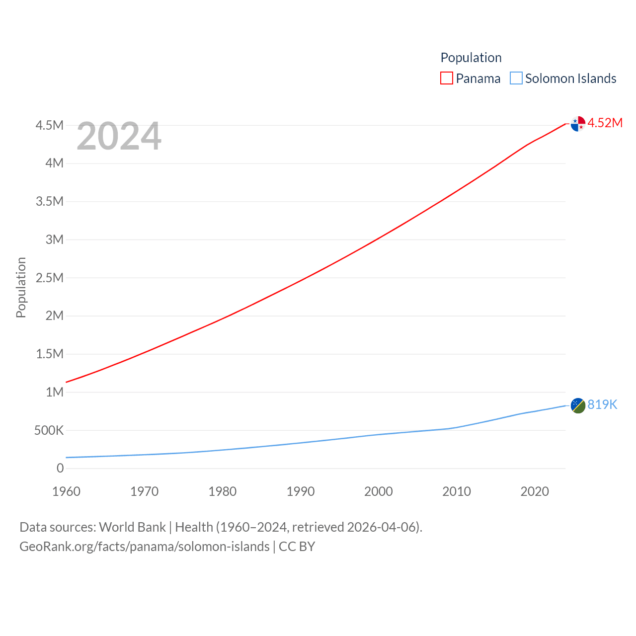 Panama has a population of 4.52M (ranked 128/197), compared with 819K in The Solomon Islands (ranked 162/197). Panama's land area is 28,641 sq mi versus 10,807 sq mi for The Solomon Islands (ranked 115th vs. 141st).