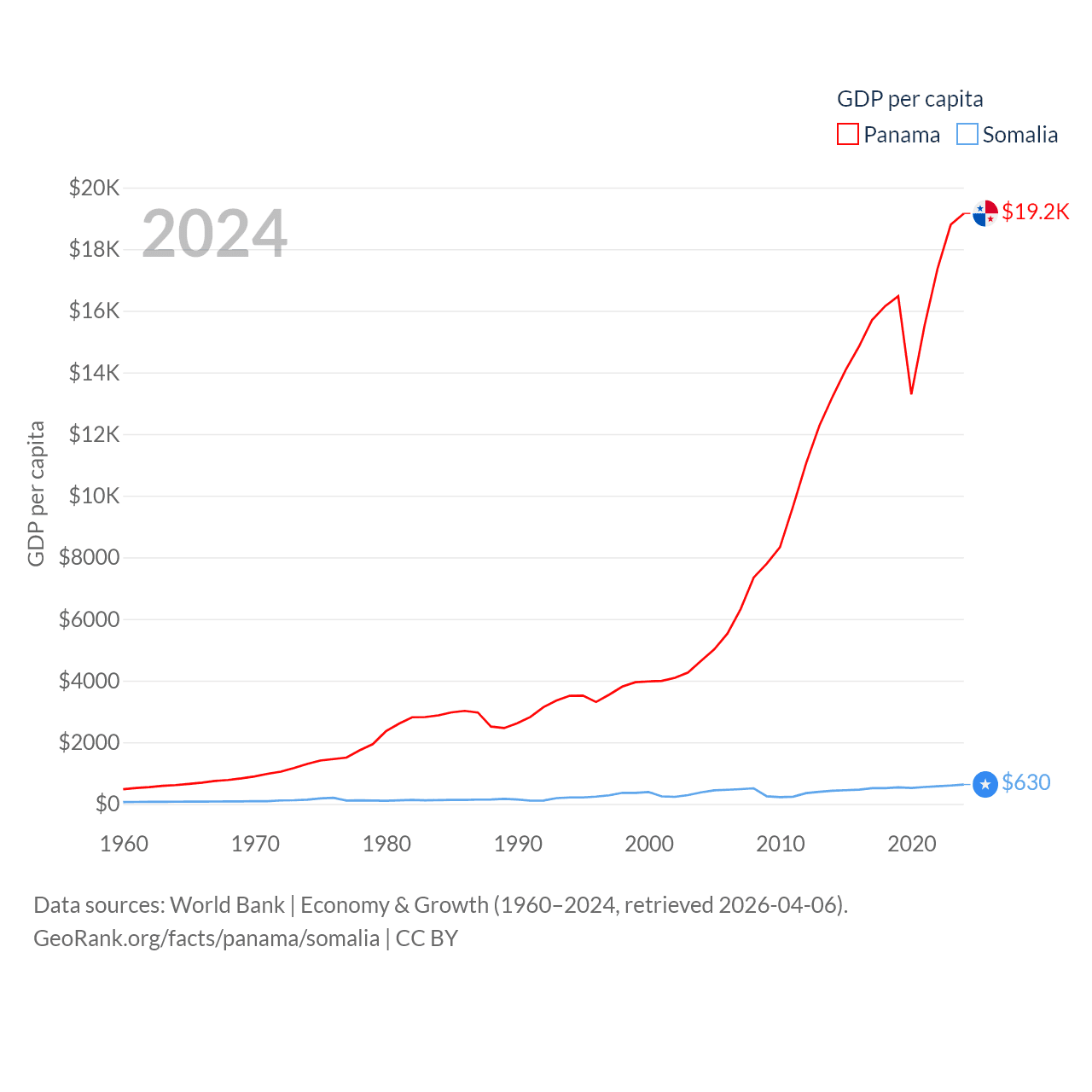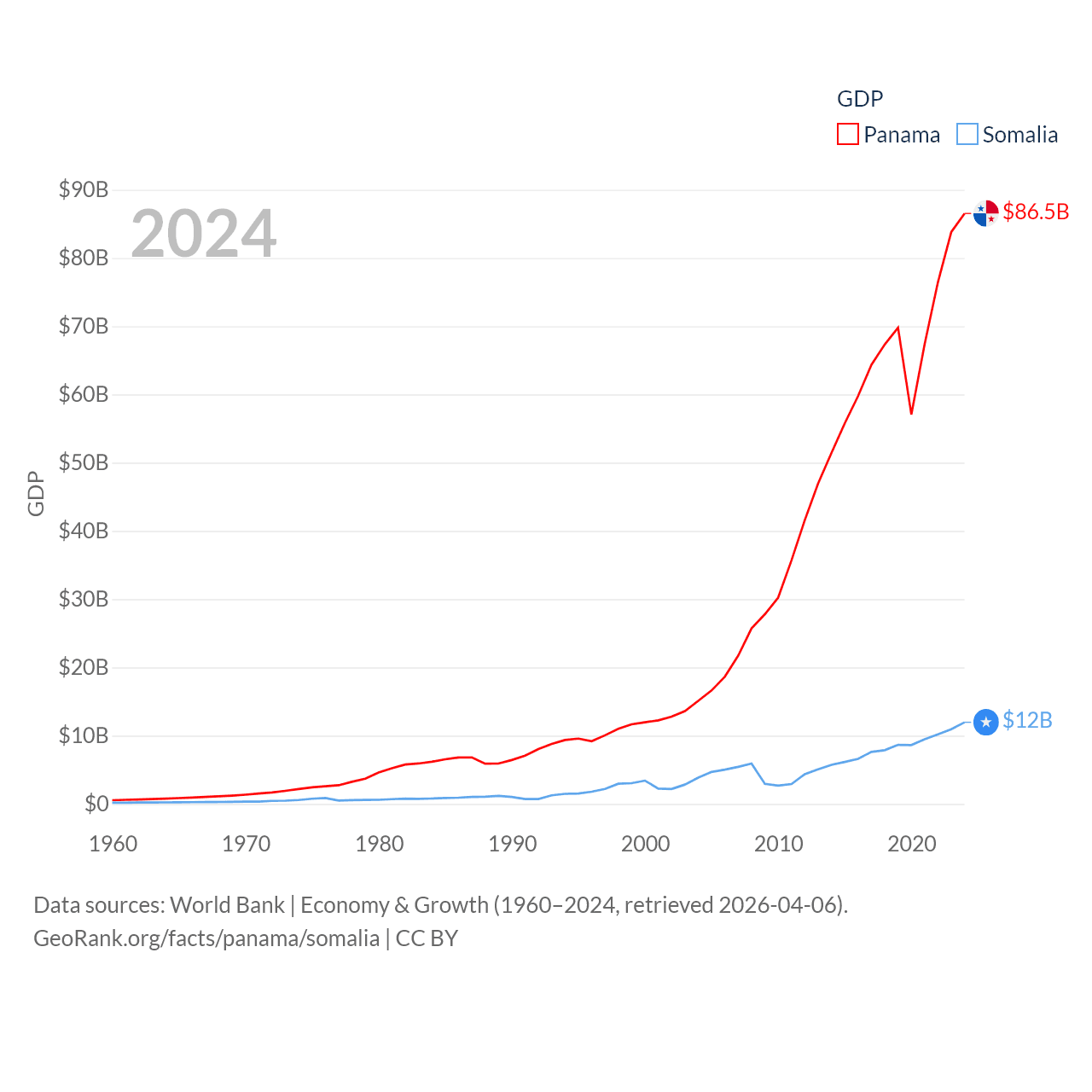 By GDP, Panama ranks 78/197 ($86.5B) and Somalia ranks 150/197 ($12B). By GDP per capita, Panama ranks 60/197 ($19,161), while Somalia ranks 192/197 ($630).