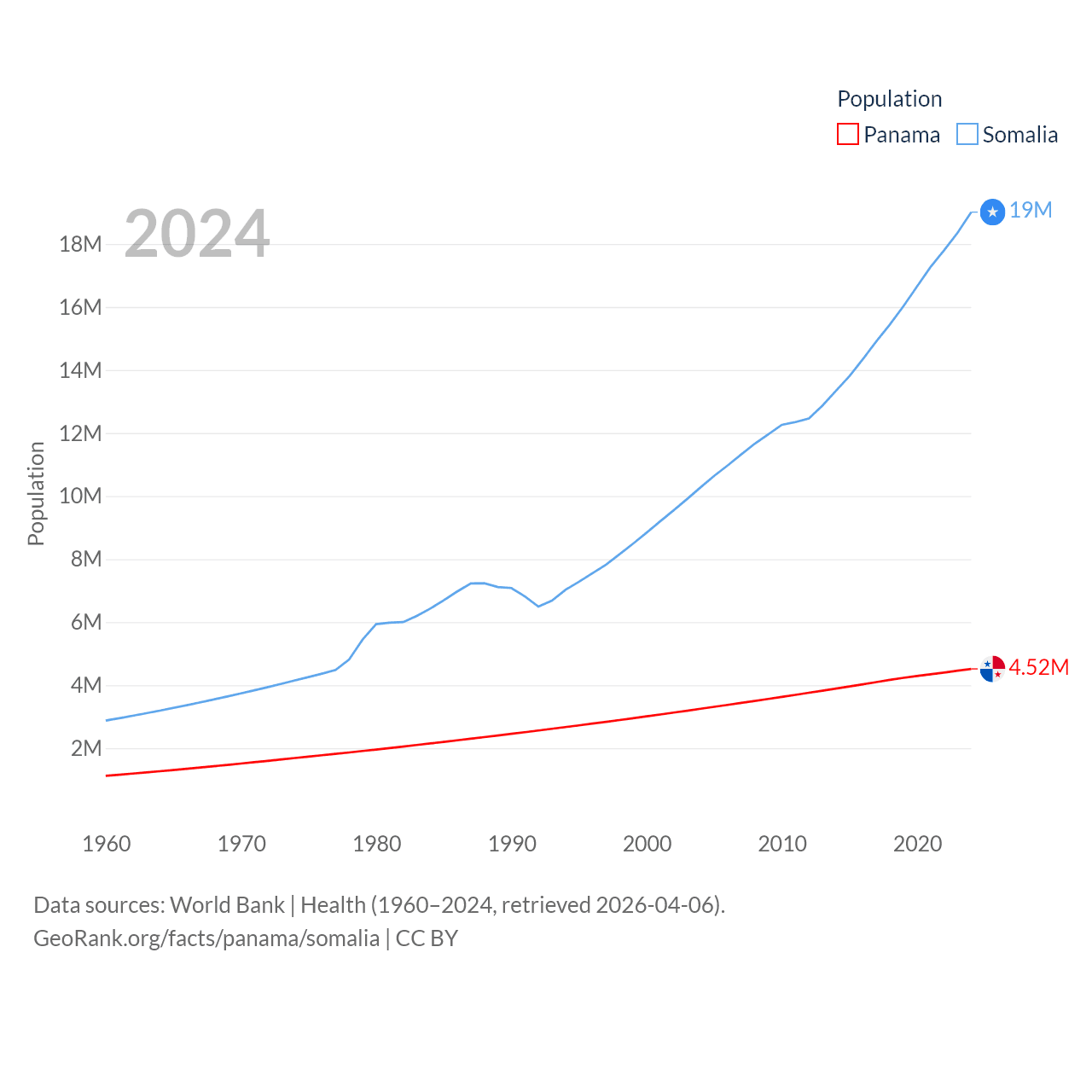 Panama has a population of 4.52M (ranked 128/197), compared with 19M in Somalia (ranked 68/197). Panama's land area is 28,641 sq mi versus 242,217 sq mi for Somalia (ranked 115th vs. 42nd).