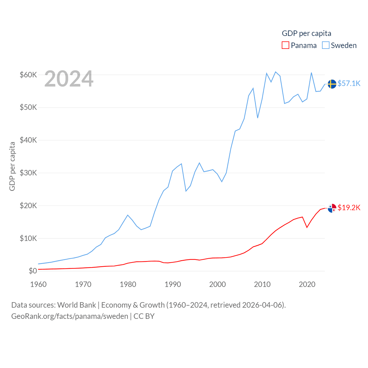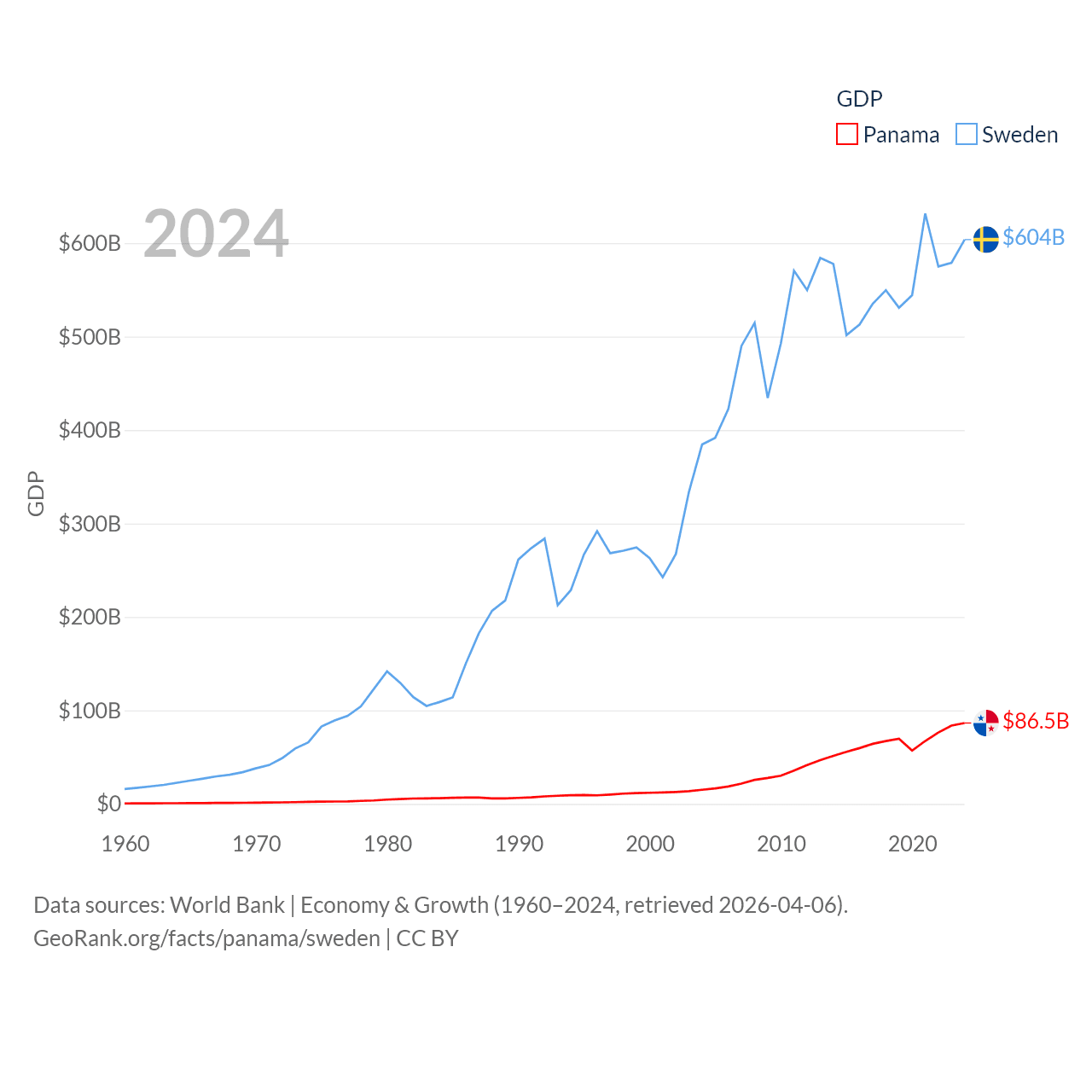 By GDP, Panama ranks 78/197 ($86.5B) and Sweden ranks 26/197 ($604B). By GDP per capita, Panama ranks 60/197 ($19,161), while Sweden ranks 17/197 ($57,117).