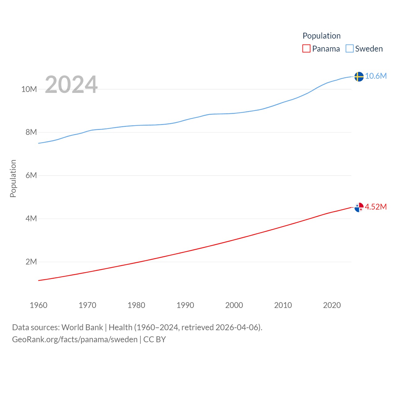 Panama has a population of 4.52M (ranked 128/197), compared with 10.6M in Sweden (ranked 93/197). Panama's land area is 28,641 sq mi versus 157,248 sq mi for Sweden (ranked 115th vs. 58th).