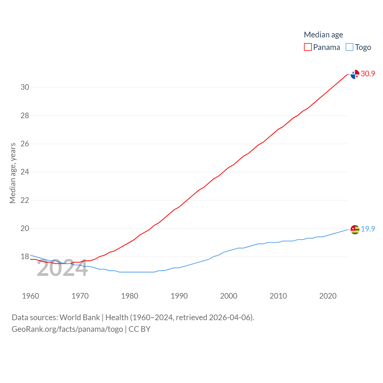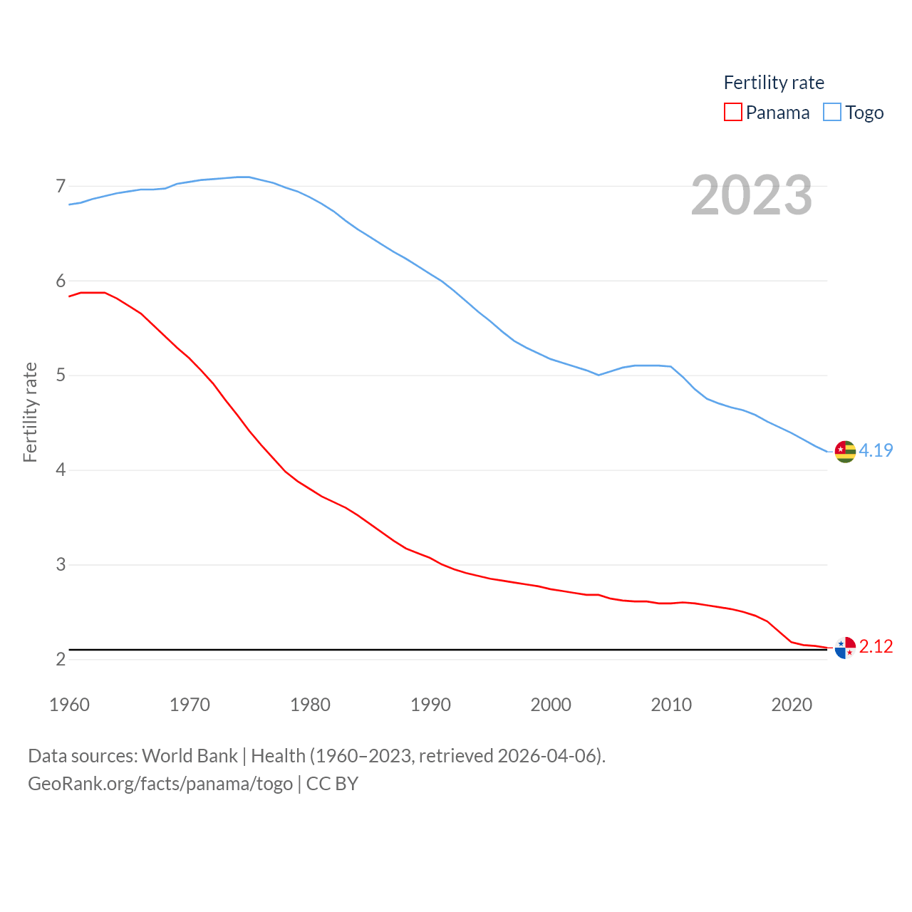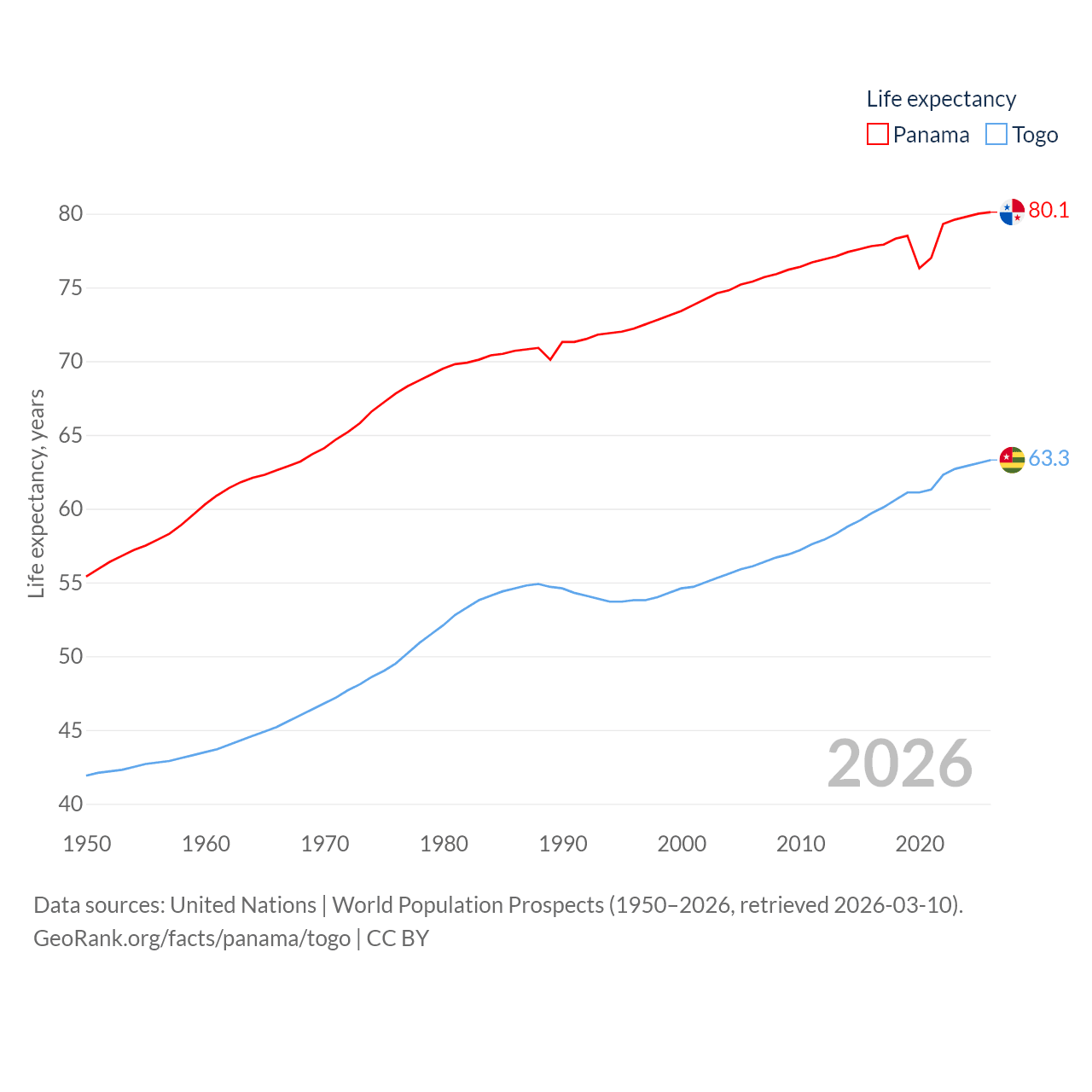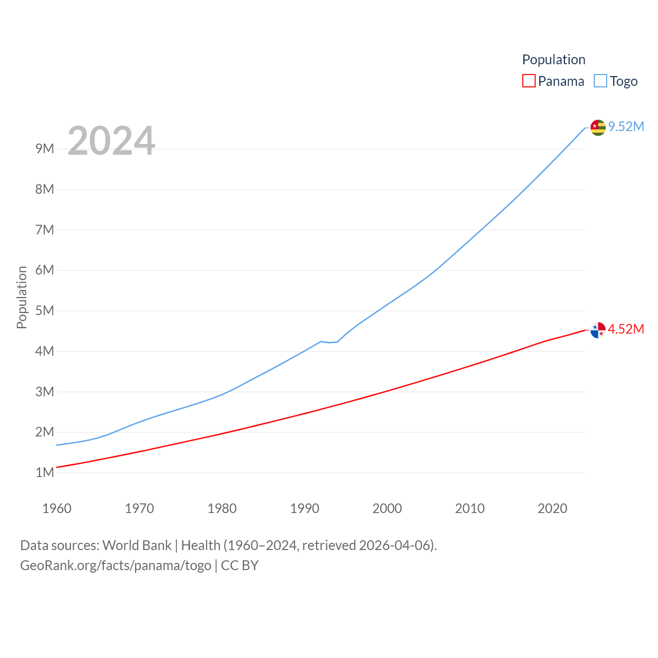 Panama has a population of 4.52M (ranked 128/197), compared with 9.52M in Togo (ranked 98/197). Panama's land area is 28,641 sq mi versus 21,000 sq mi for Togo (ranked 115th vs. 124th).