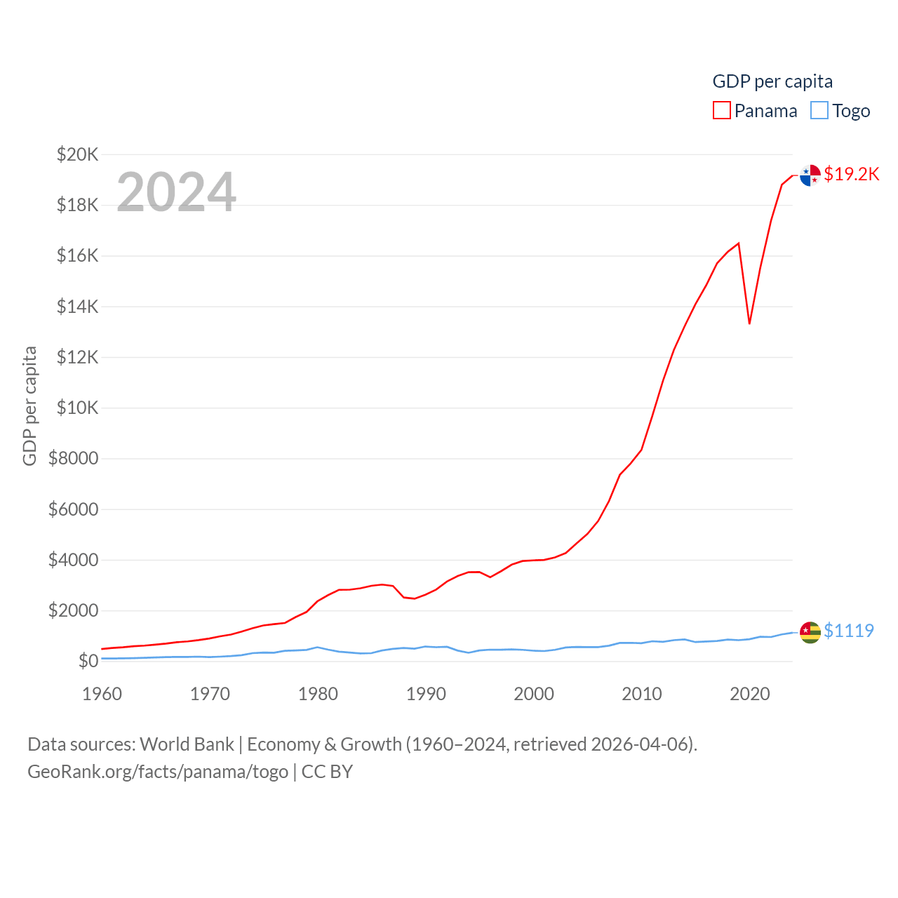 By GDP, Panama ranks 78/197 ($86.5B) and Togo ranks 154/197 ($10.7B). By GDP per capita, Panama ranks 60/197 ($19,161), while Togo ranks 172/197 ($1,119).