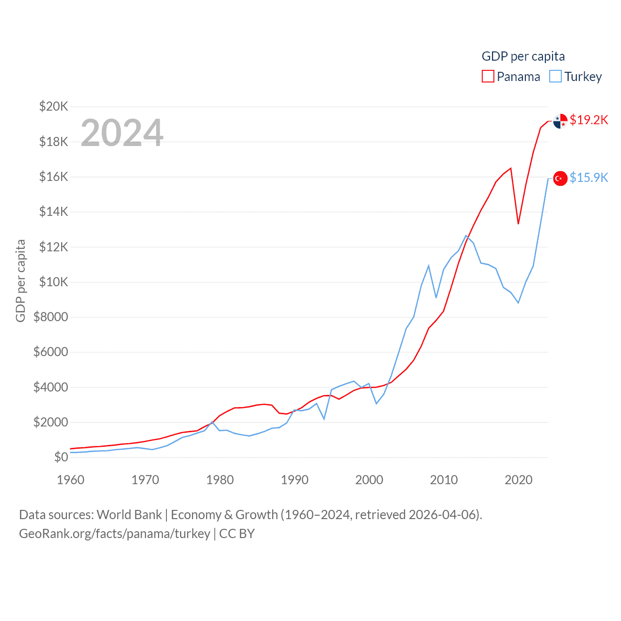 By GDP, Panama ranks 78/197 ($86.5B) and Turkey ranks 17/197 ($1.36T). By GDP per capita, Panama ranks 60/197 ($19,161), while Turkey ranks 66/197 ($15,893).