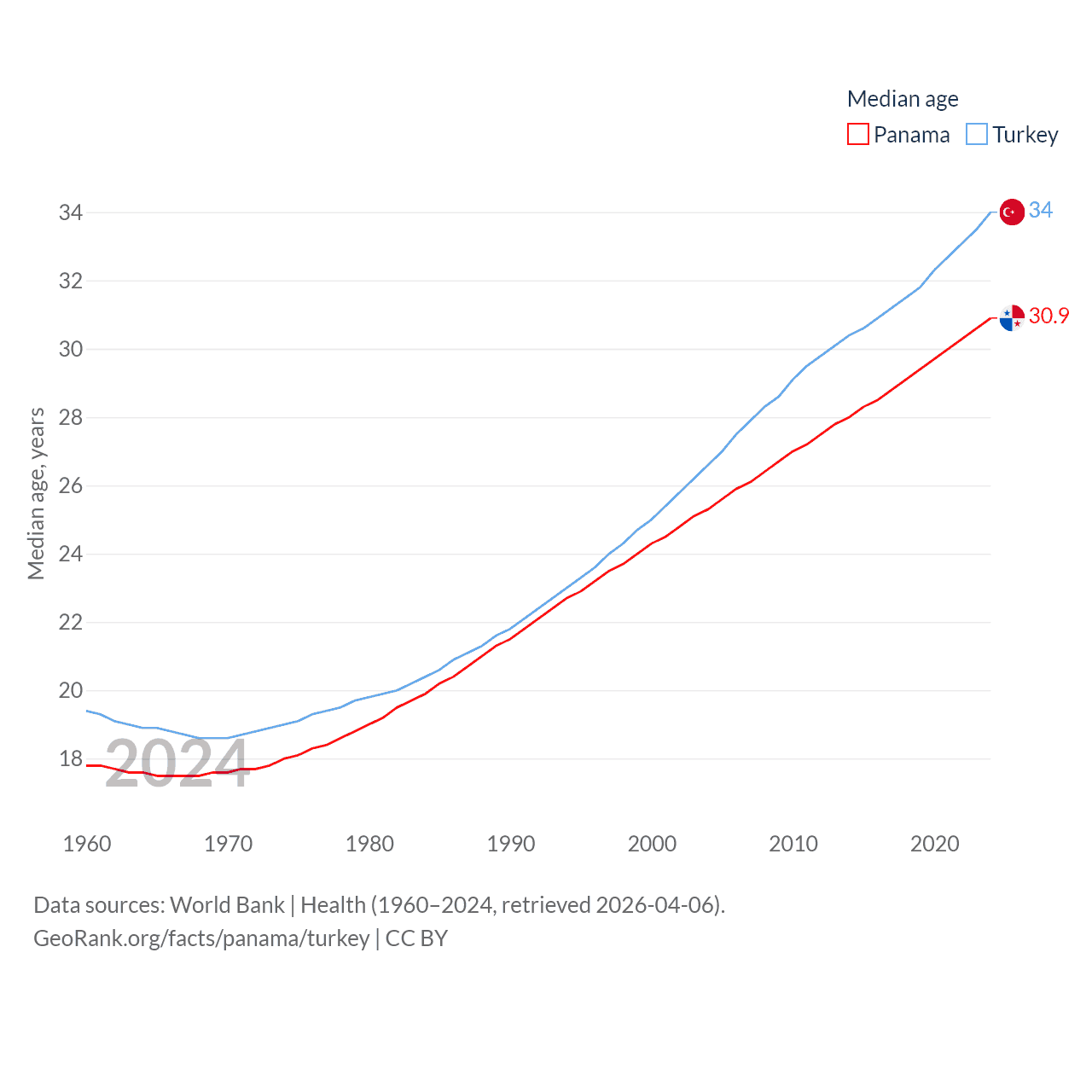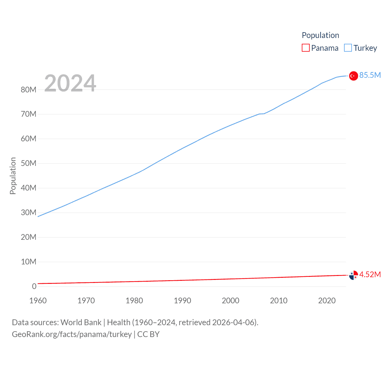 Panama has a population of 4.52M (ranked 128/197), compared with 85.5M in Turkey (ranked 18/197). Panama's land area is 28,641 sq mi versus 297,156 sq mi for Turkey (ranked 115th vs. 36th).
