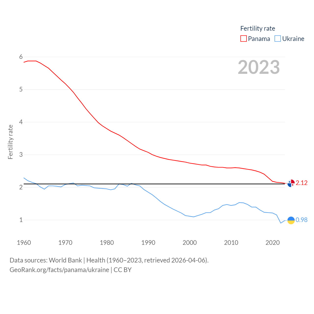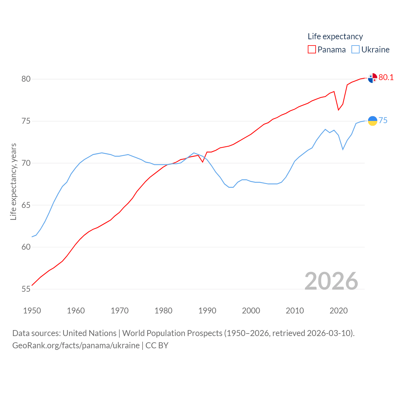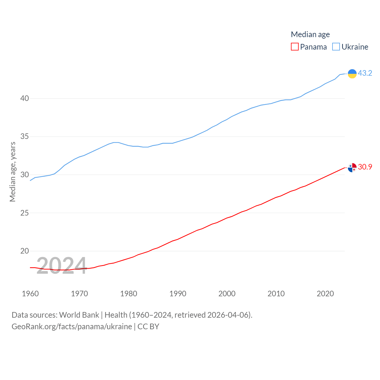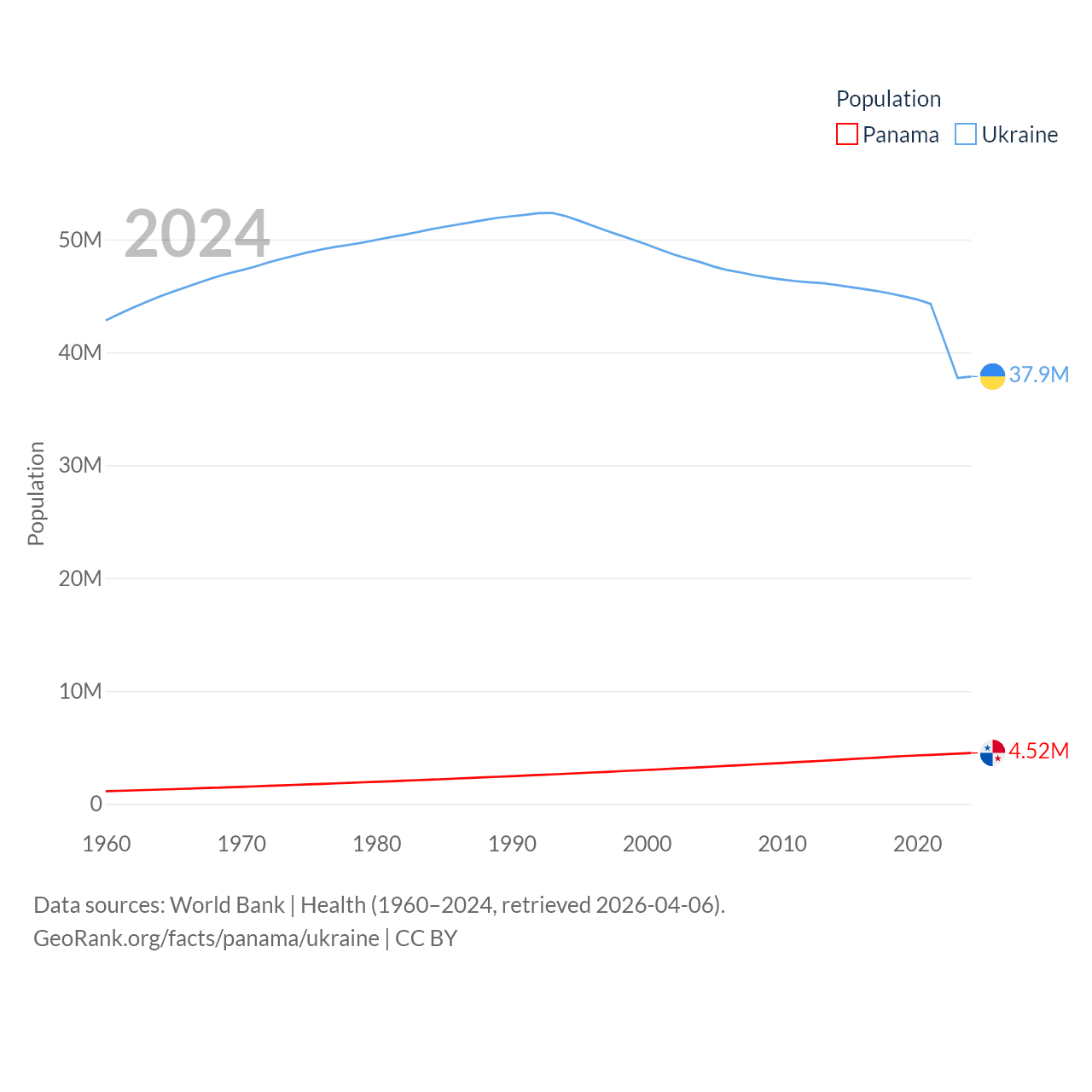 Panama has a population of 4.52M (ranked 128/197), compared with 37.9M in Ukraine (ranked 41/197). Panama's land area is 28,641 sq mi versus 223,708 sq mi for Ukraine (ranked 115th vs. 46th).