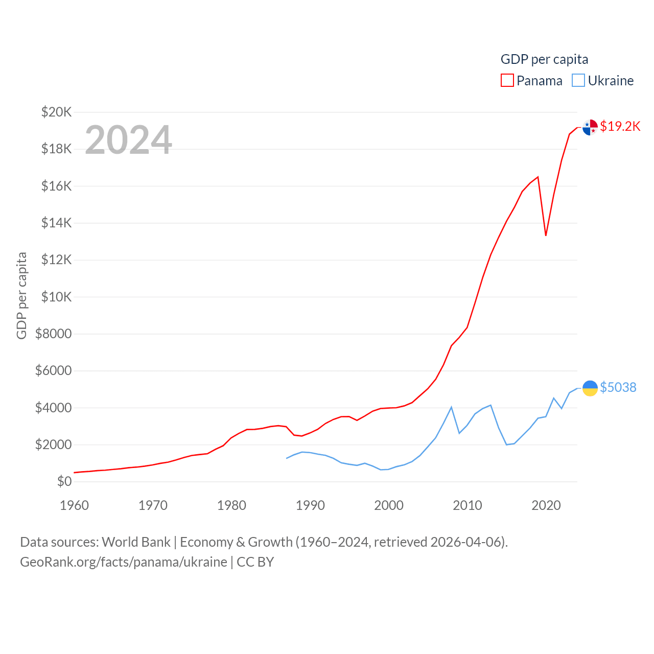 By GDP, Panama ranks 78/197 ($86.5B) and Ukraine ranks 57/197 ($191B). By GDP per capita, Panama ranks 60/197 ($19,161), while Ukraine ranks 120/197 ($5,038).