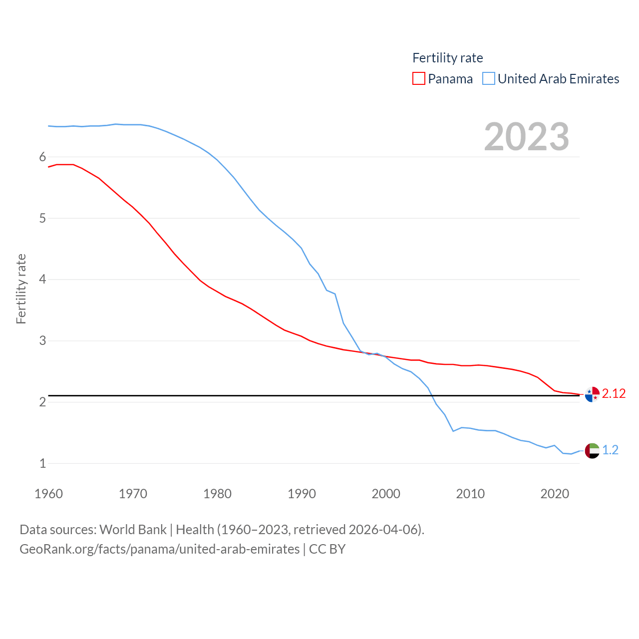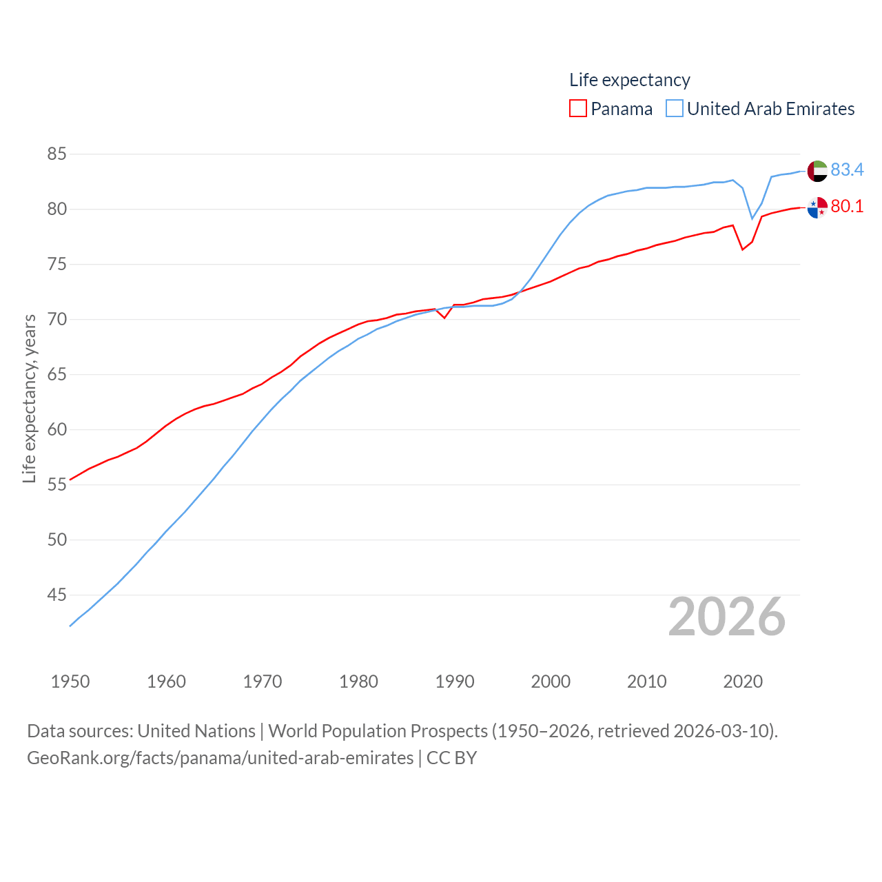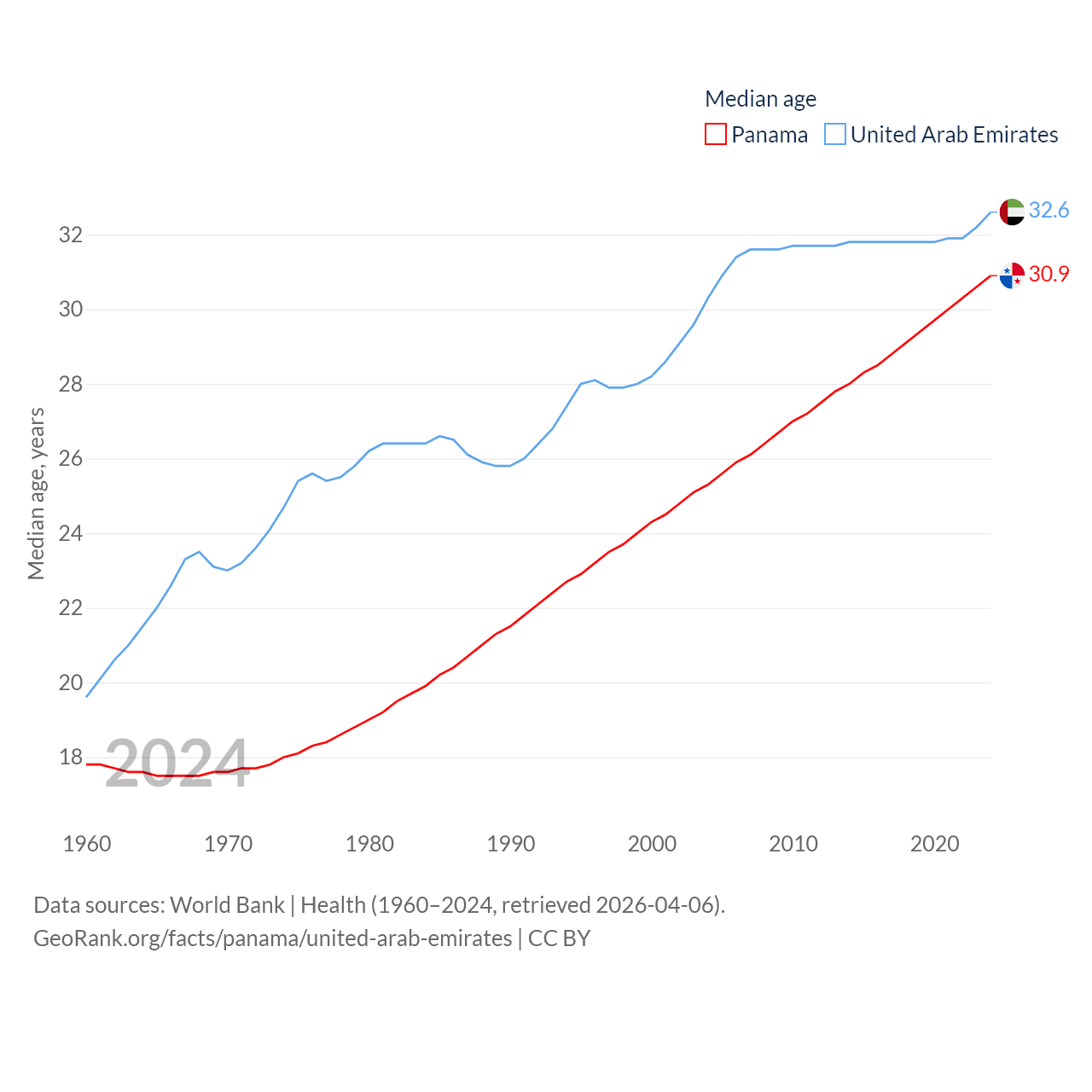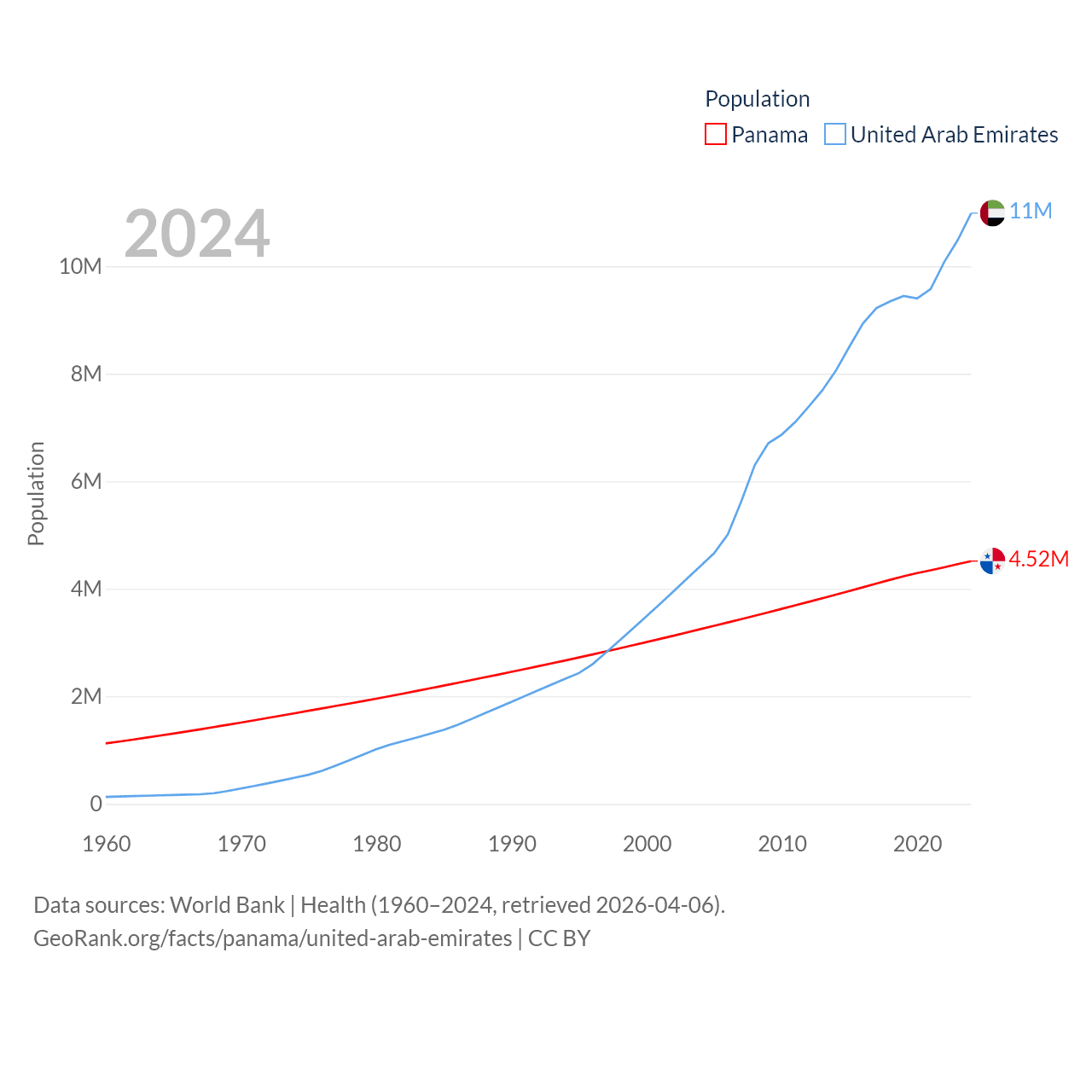 Panama has a population of 4.52M (ranked 128/197), compared with 11M in The United Arab Emirates (ranked 86/197). Panama's land area is 28,641 sq mi versus 27,421 sq mi for The United Arab Emirates (ranked 115th vs. 117th).