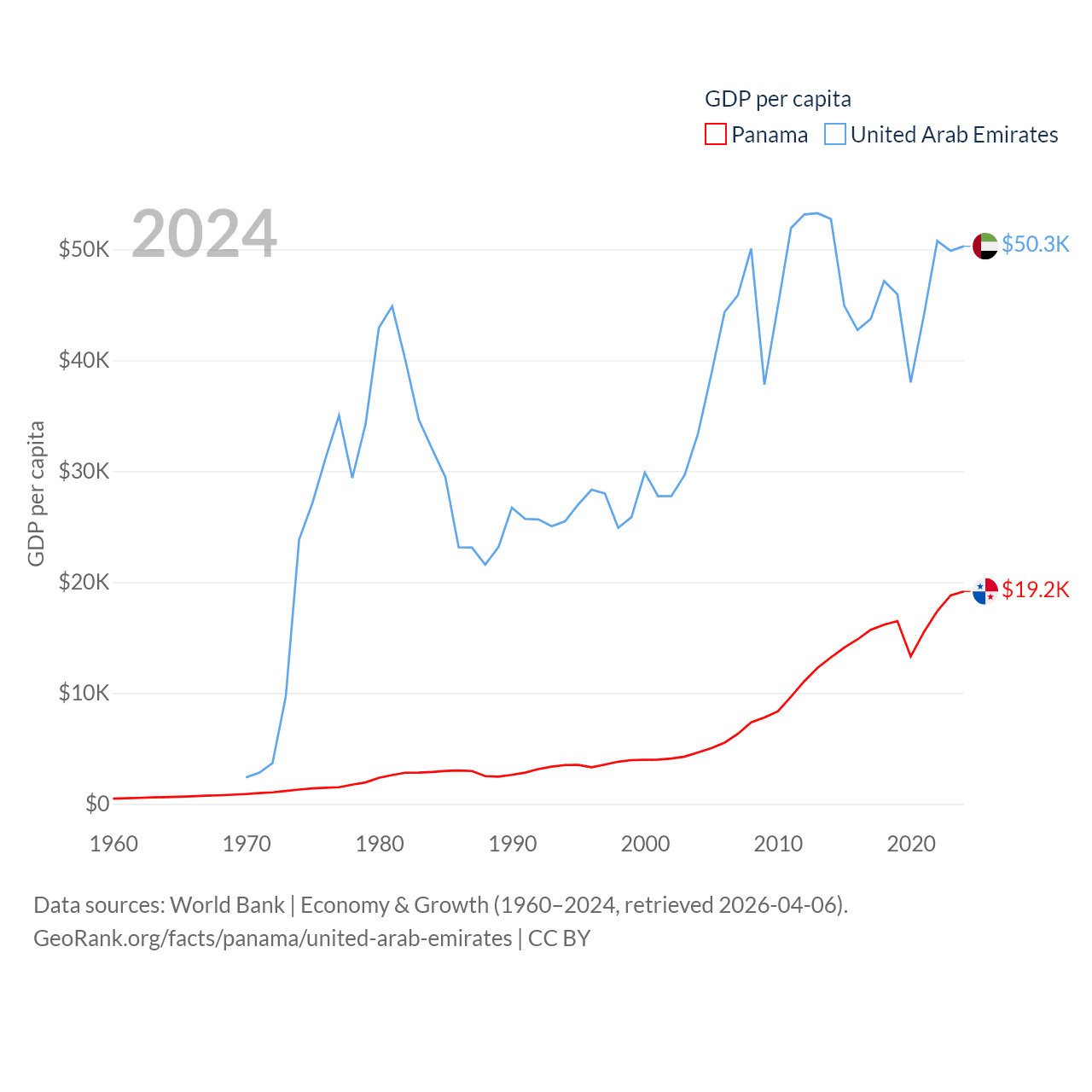 By GDP, Panama ranks 78/197 ($86.5B) and The United Arab Emirates ranks 27/197 ($552B). By GDP per capita, Panama ranks 60/197 ($19,161), while The United Arab Emirates ranks 24/197 ($50,274).