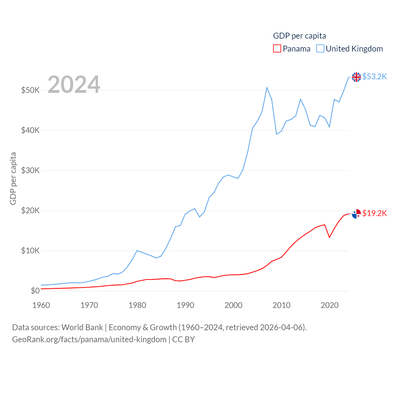 By GDP, Panama ranks 78/197 ($86.5B) and The United Kingdom ranks 6/197 ($3.69T). By GDP per capita, Panama ranks 60/197 ($19,161), while The United Kingdom ranks 22/197 ($53,246).