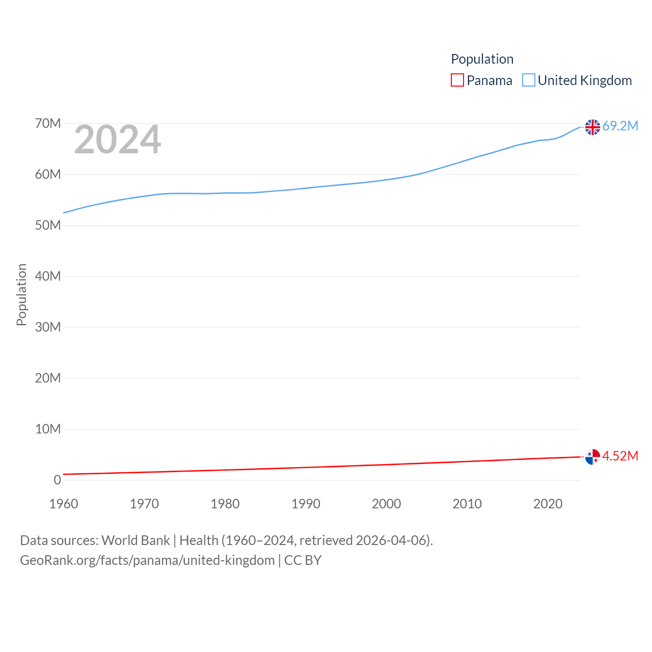 Panama has a population of 4.52M (ranked 128/197), compared with 69.2M in The United Kingdom (ranked 21/197). Panama's land area is 28,641 sq mi versus 93,410 sq mi for The United Kingdom (ranked 115th vs. 78th).