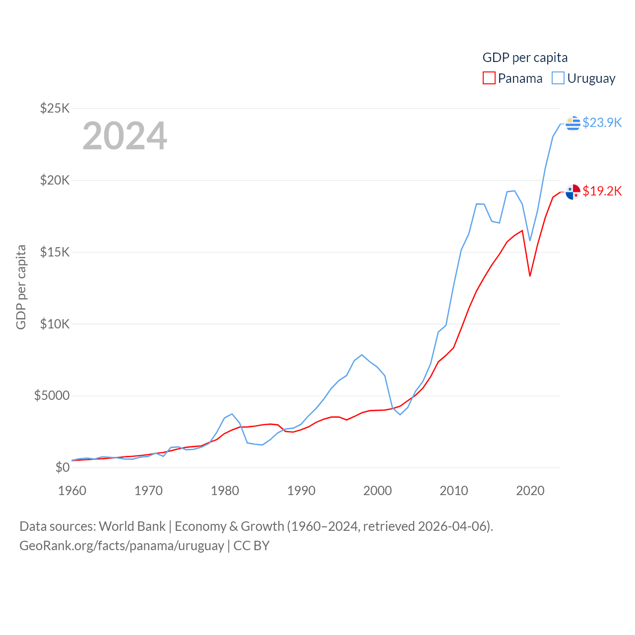 By GDP, Panama ranks 78/197 ($86.5B) and Uruguay ranks 81/197 ($81B). By GDP per capita, Panama ranks 60/197 ($19,161), while Uruguay ranks 52/197 ($23,907).
