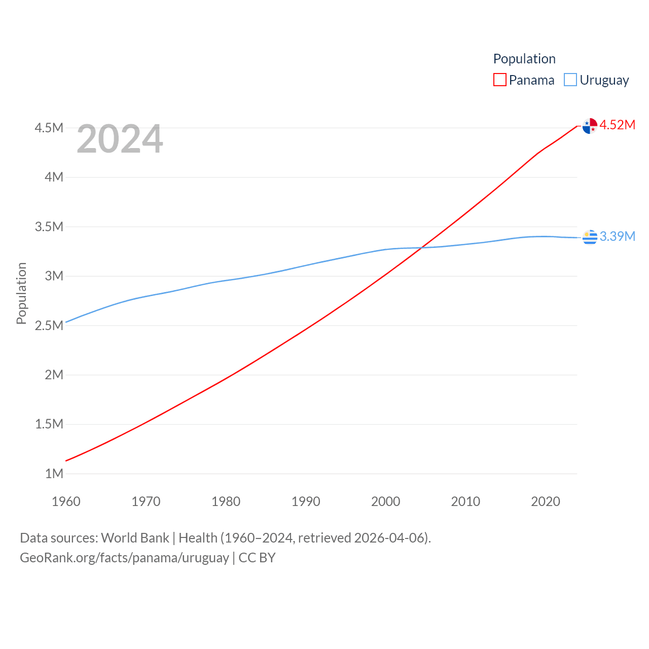 Panama has a population of 4.52M (ranked 128/197), compared with 3.39M in Uruguay (ranked 133/197). Panama's land area is 28,641 sq mi versus 67,576 sq mi for Uruguay (ranked 115th vs. 89th).