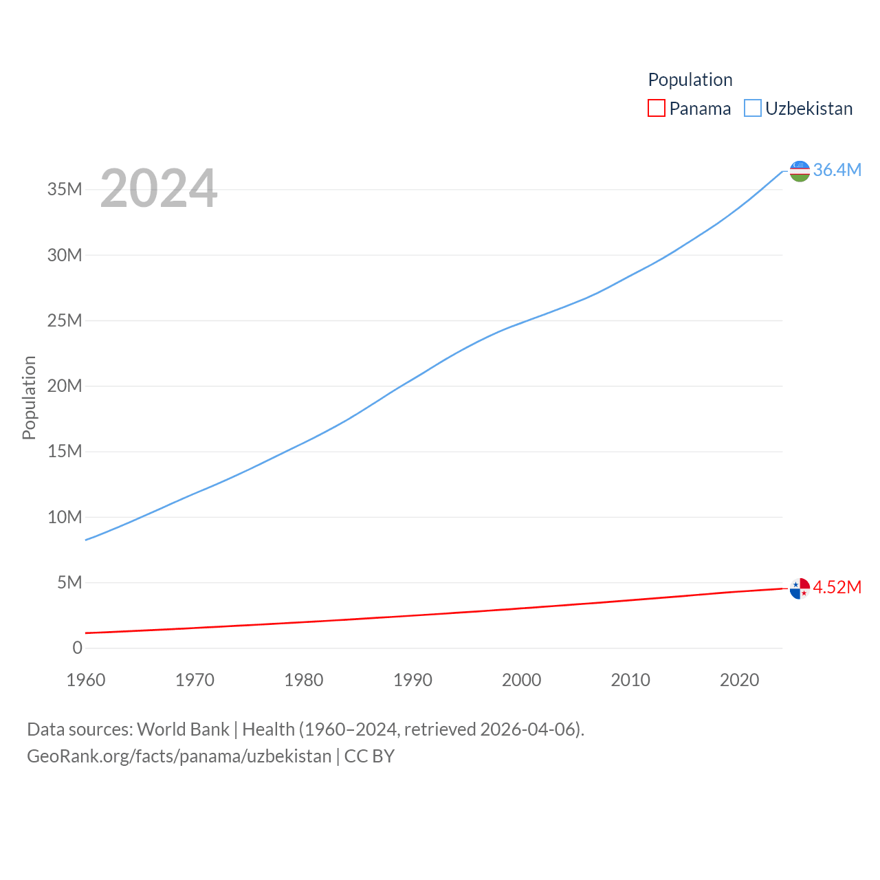 Panama has a population of 4.52M (ranked 128/197), compared with 36.4M in Uzbekistan (ranked 43/197). Panama's land area is 28,641 sq mi versus 170,136 sq mi for Uzbekistan (ranked 115th vs. 56th).